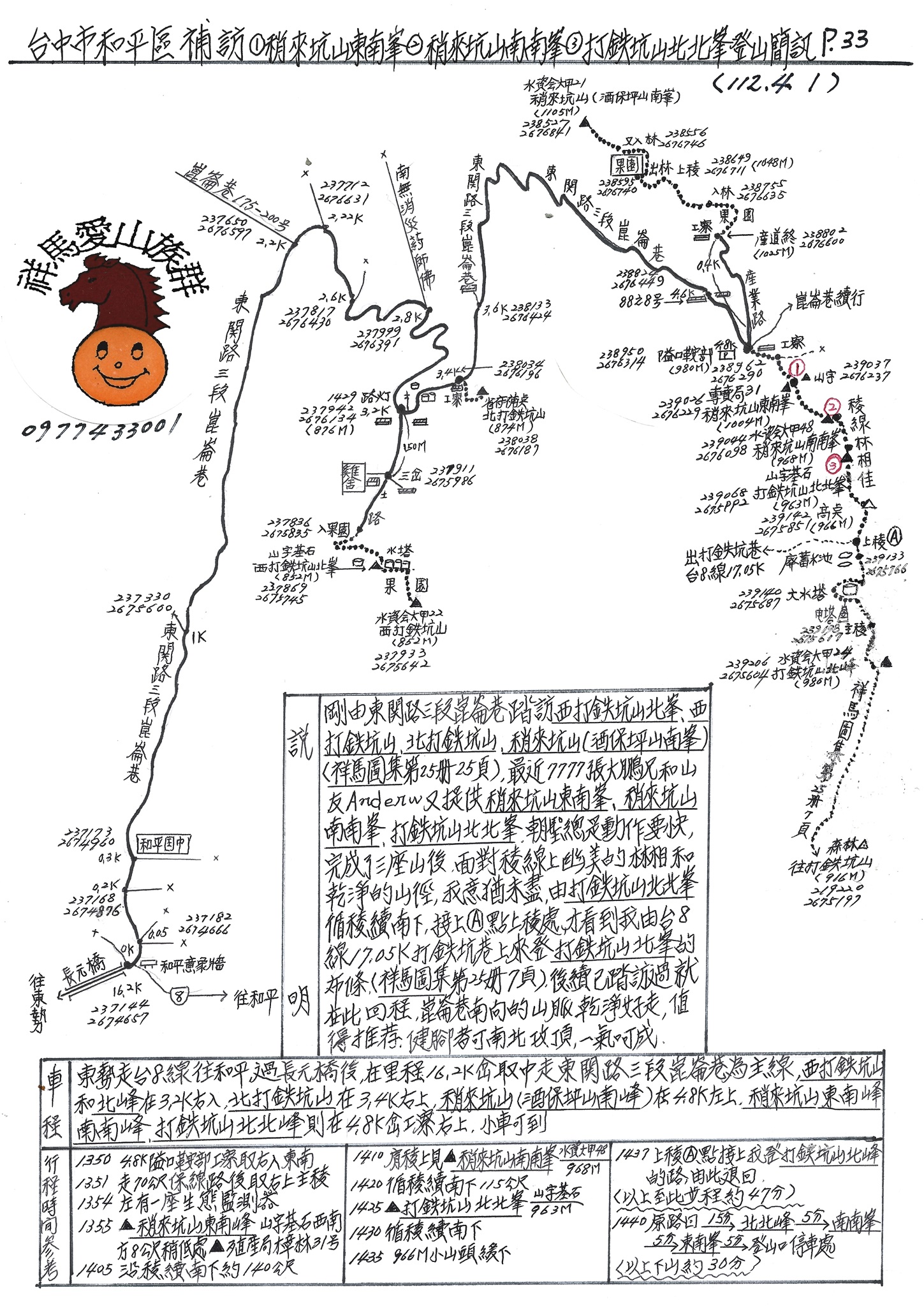 5稍來坑山南南峰(標高968M,水資會大甲48號基石),座標:239044.2676098