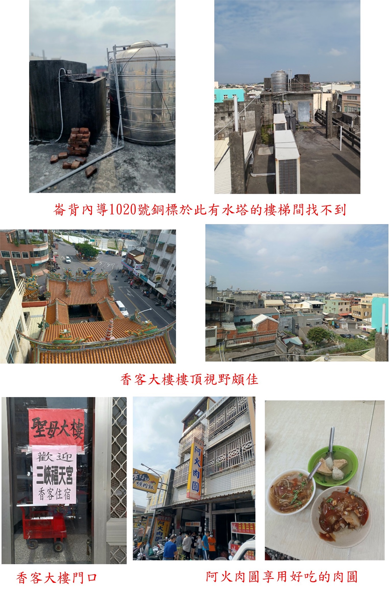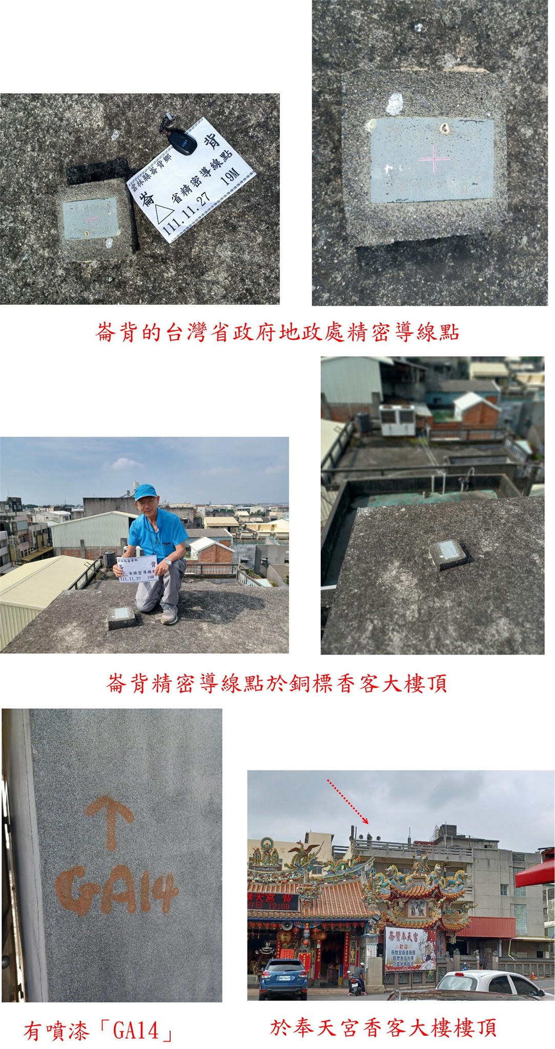 進入奉天宮詢問有位善心的工作人員帶領至廟後方的香客大樓,由廟宇側面中山路開鐵門進入香客大樓,上到3樓頂有鐵梯可利用,有噴漆「GA14」,上到樓梯間樓頂,即見到崙背的台灣省政府地政處精密導線點;此點於沒水塔的樓梯間上方,係林奕慶山友找到來補,樓頂視野頗佳,相距10餘公尺有另一有水塔的樓梯間,資料有顆崙背內導1020號銅標,有爬上去看但找不到應已遺失。