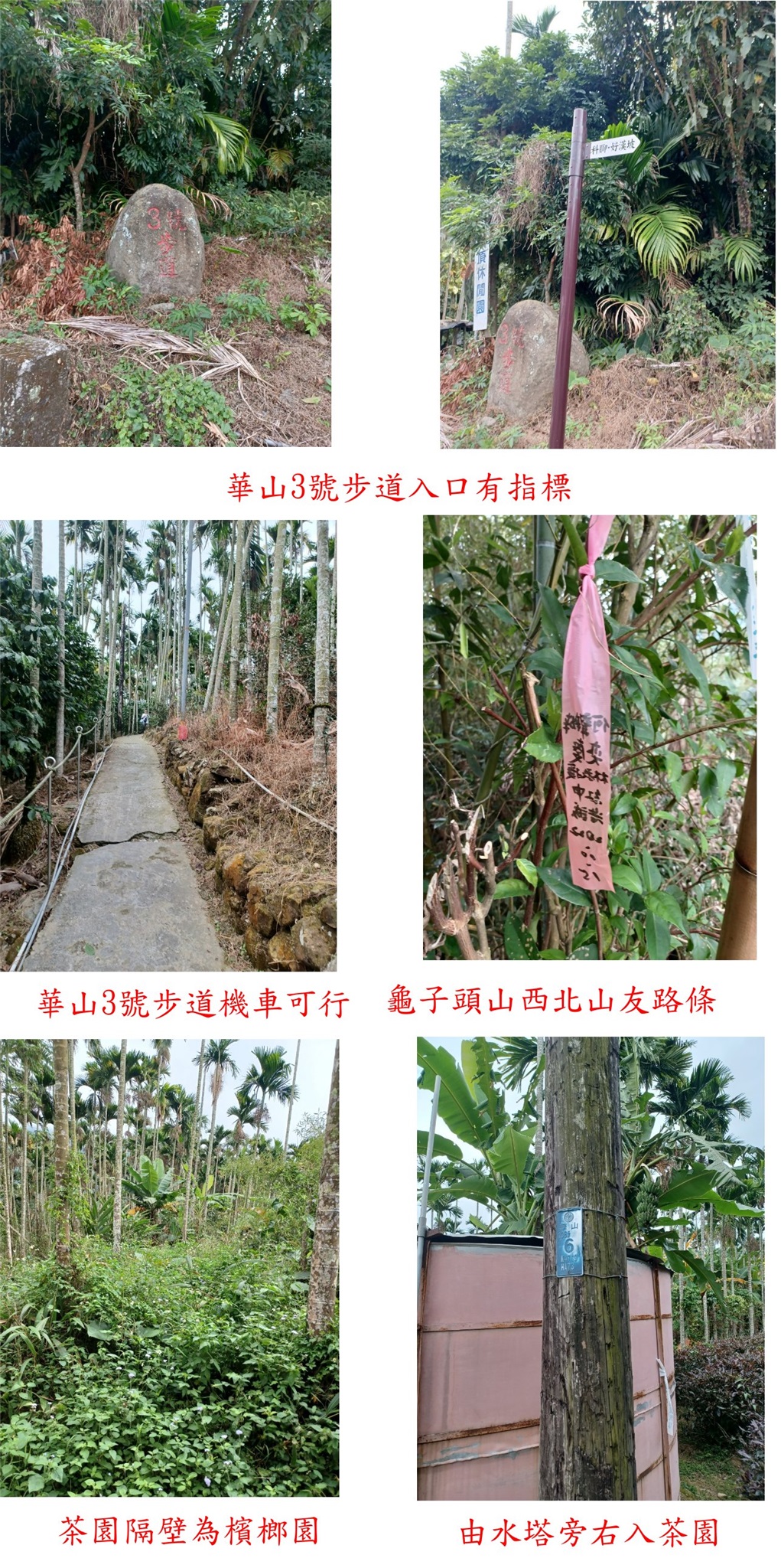 取左華山步道(機車可行)走215公尺,木電桿為「華山108分6」號,由水塔旁右入茶園走約70公尺,於茶園西北方靠近崖邊處、見到龜子頭山西北的省政府圖根補點;基石很明顯於竹林小徑的入口,此點係台東阿倫等4位山友尋獲來補,上山只要5分鐘,往返費時17分鐘。