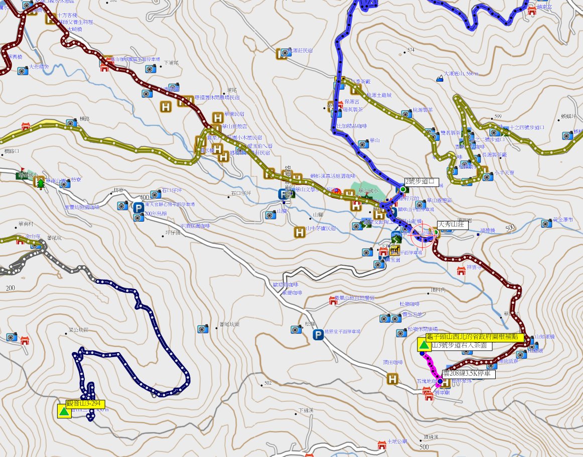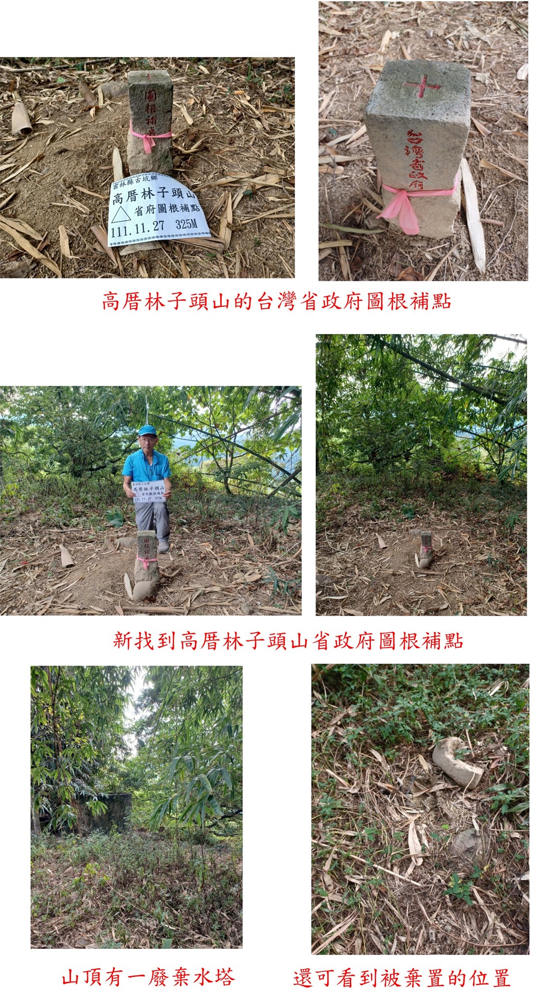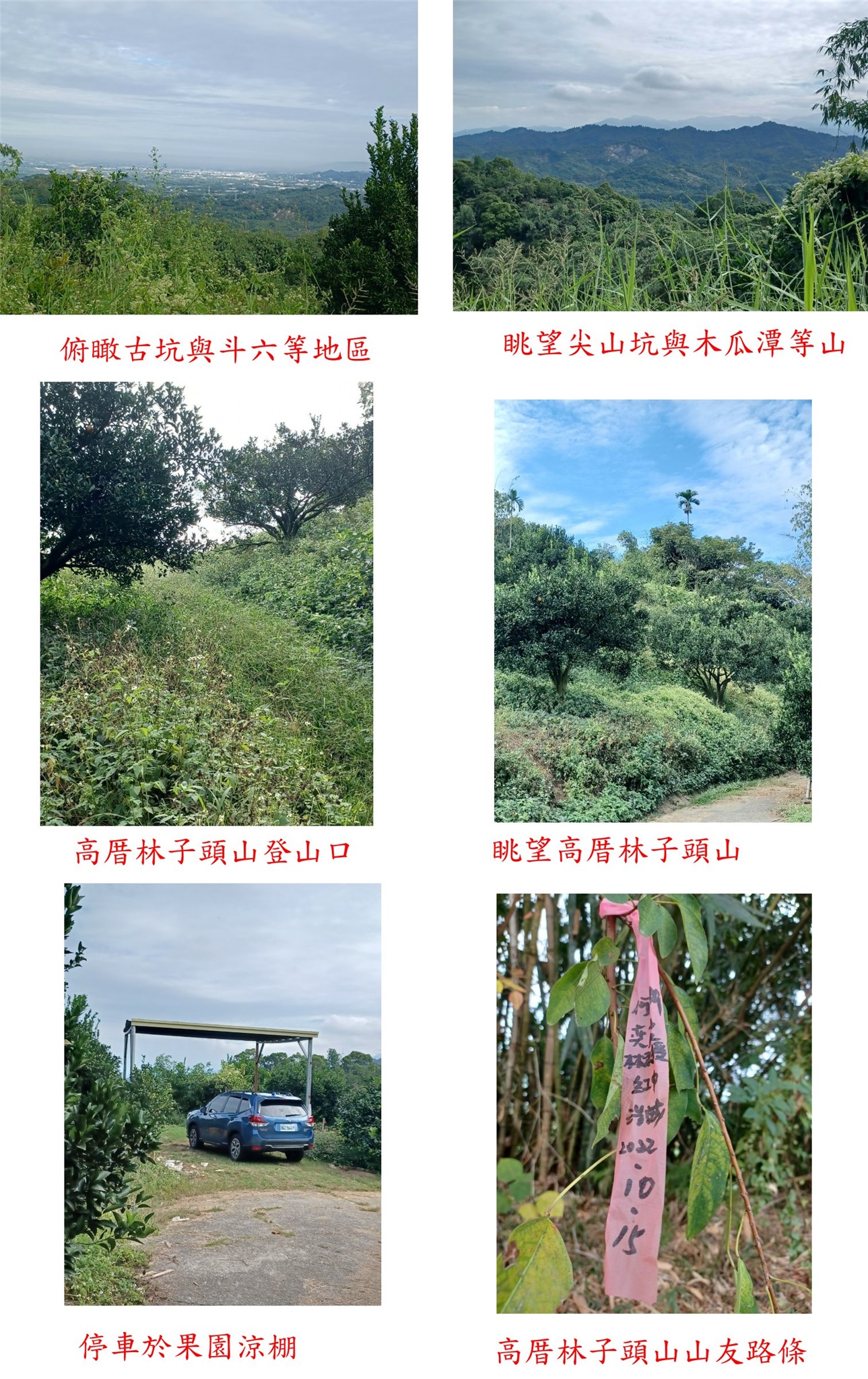 1、高厝林子頭山:位於雲林縣古坑鄉,標高352公尺,台灣省政府圖根補點;座標208896 2615572。