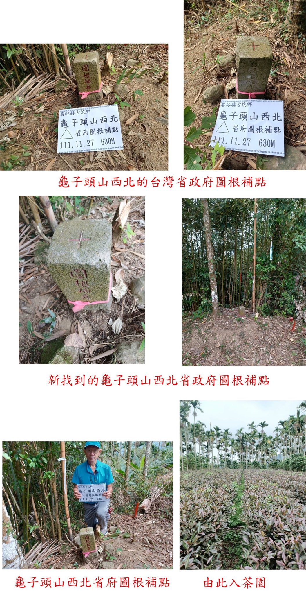 11/27來到雲林撿3顆山友新找到的基石,第1座為高厝林子頭山的省政府圖根補點,由158甲線44.1K叉路轉農路走1.6K於果園涼棚停車,進入果園至小山頭即抵達基石,上山只要4分鐘;第2座為龜子頭山西北的省政府圖根補點,古坑的雲208線3.5K處停車,取華山3號步道上山走220公尺,右入茶園走60餘公尺即見到基石,上山只要5分鐘;第3顆為崙背的省府精密導線點,於崙背奉天宮香客大樓的樓頂,銅標基點於3樓頂,於沒水塔的樓梯間上方,相距10餘公尺另有顆崙背內導1020號銅標但找不到;另於奉天宮前圓環內草地,見到1顆崙背鄉公所NO.02水準點,旁還有顆水利署98.06水準樁。