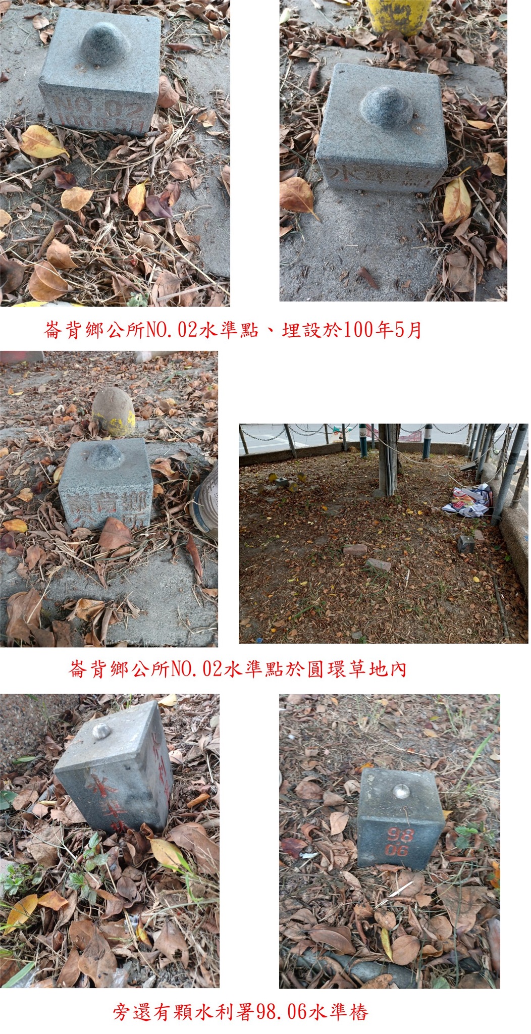3、崙背:位於雲林縣崙背鄉,標高43公尺,台灣省政府地政處精密導線點,另有內導1020號銅標應已遺失;座標183239 2628895。