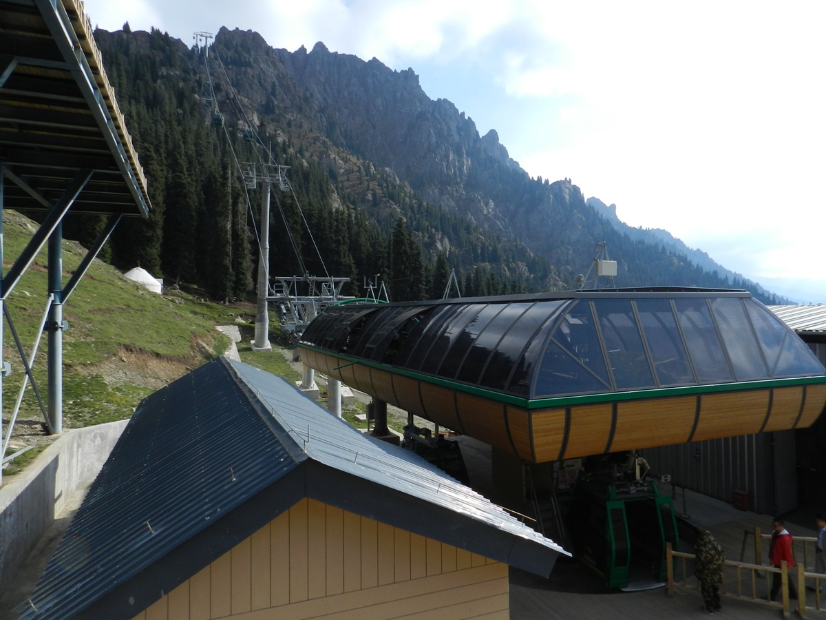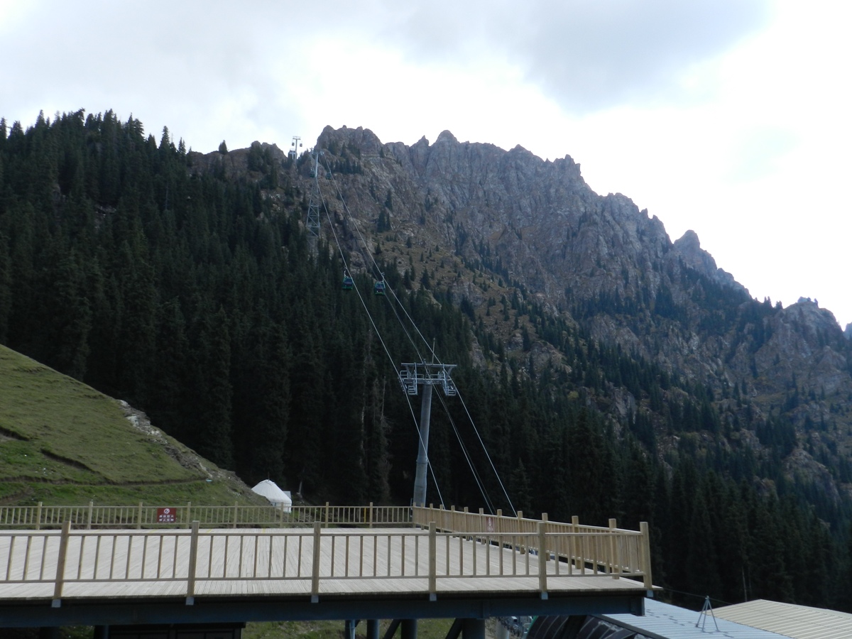 由於時間不夠,沒有搭乘游湖船遊覽,在飽覽天池風光及殺了許多照片後,直接到路邊的天池停車場搭乘往马牙山的覌光车。以人民幣100元購買往马牙山覌光车票後,開始搭乘覌光车上山,覌光车沿途會在銅像觀景台及較高的木造地板觀景台停車,讓遊客由高處欣賞天池及附近的高山風光。由天池停車場走約7.5K可到马牙山索道的停車場,此地海拔約2450公尺。下車後走約50公尺到索道起點站,以人民幣120元購買马牙山索道來回票,搭乘索道纜車上山,爬升約300公尺到索道終點站,此地海拔約2760公尺。