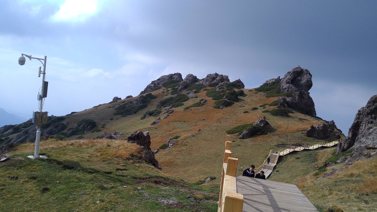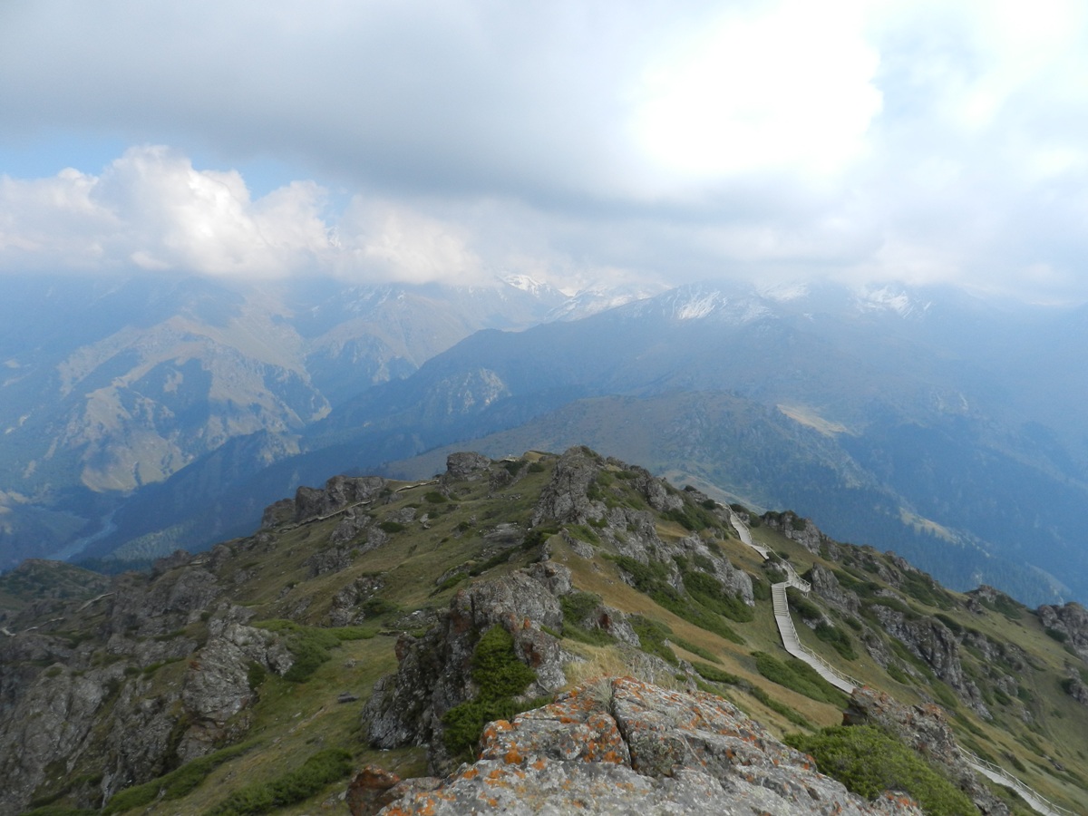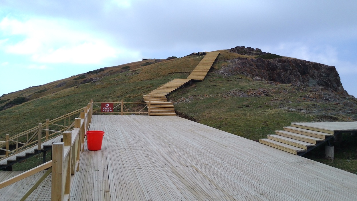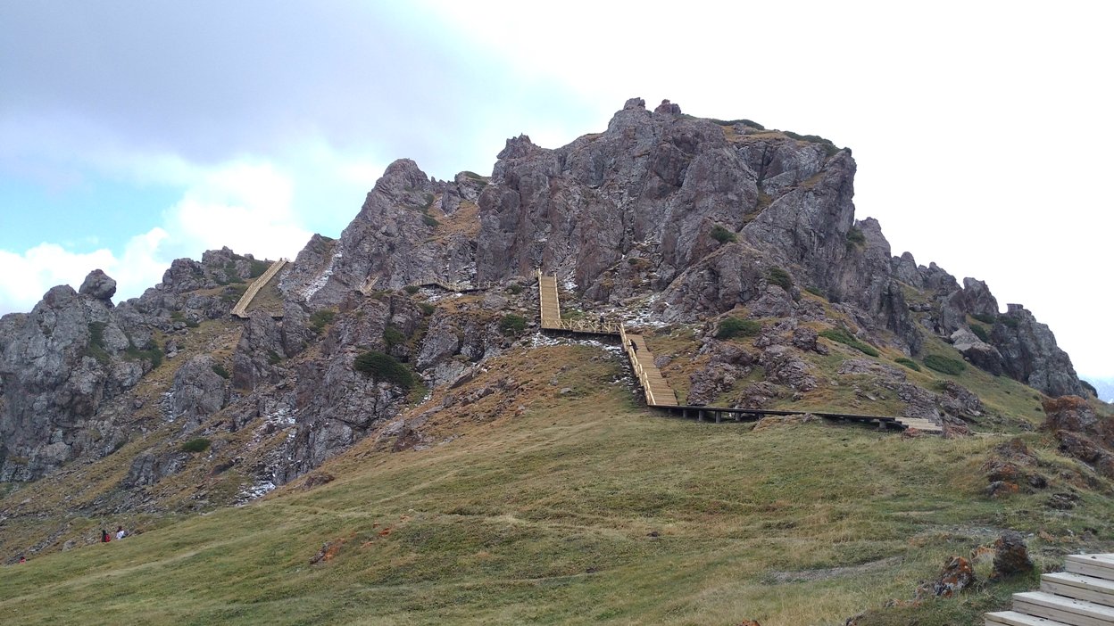 於索道終點站前平台觀景台瀏覽天池及附近的高山風光後,開始沿木階步道陡上,走約30分鐘到第一處景觀台,此地海拔約2840公尺,也是瀏覽天池的好地方,一般民眾大多止步于此。