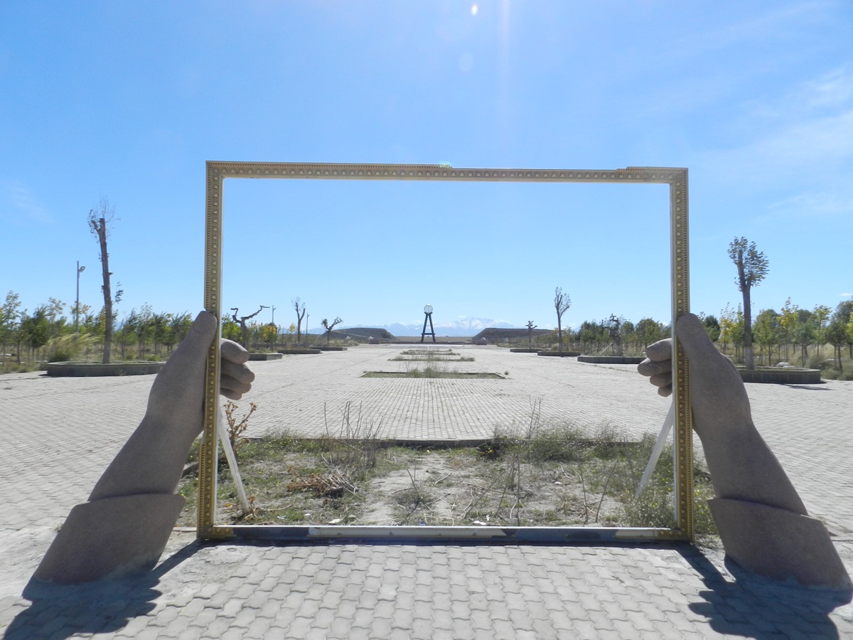 停車後由文化廣場繼續順大路向南走,中途的路中央有一兩手扶住相框的設計,可在此取景遠拍亞洲大陸地理中心标志塔。