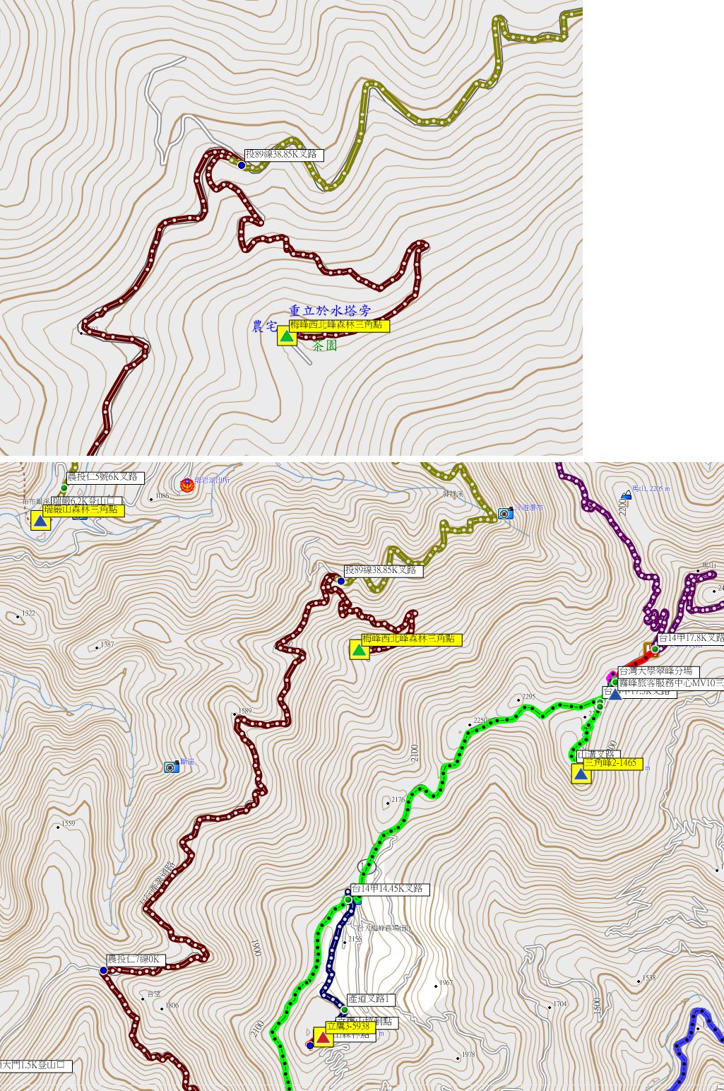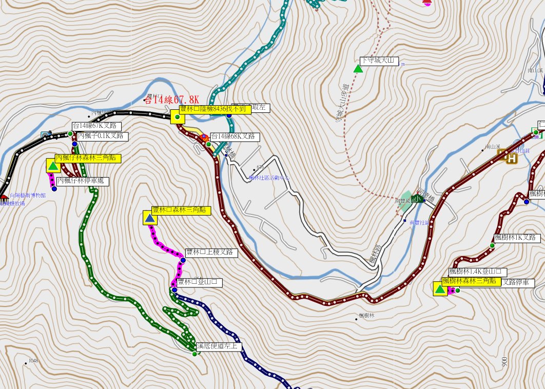 1、豐林口:位於南投縣仁愛鄉,標高640公尺,一等水準點陸檢8436號找不到;座標255666 2655752。