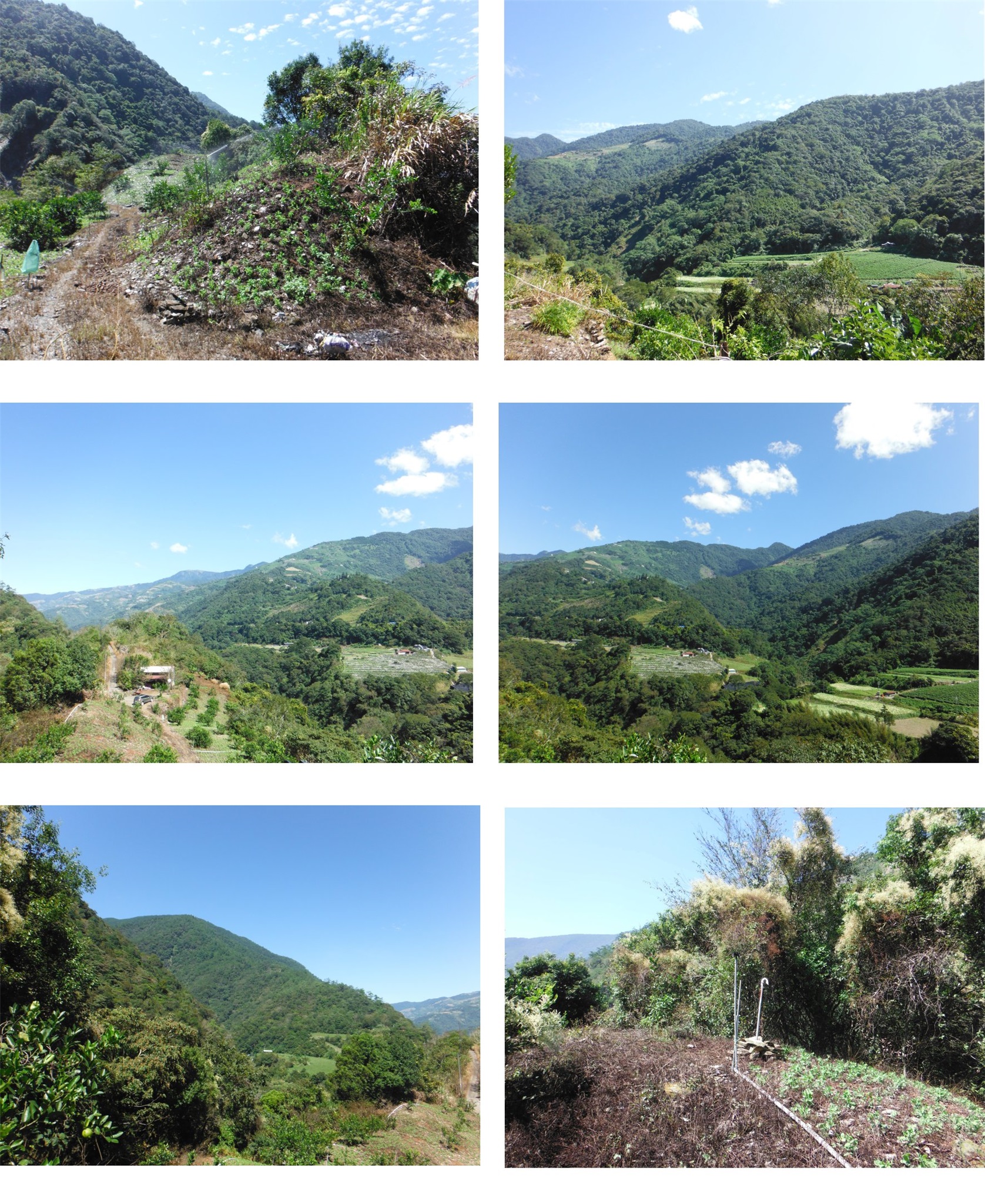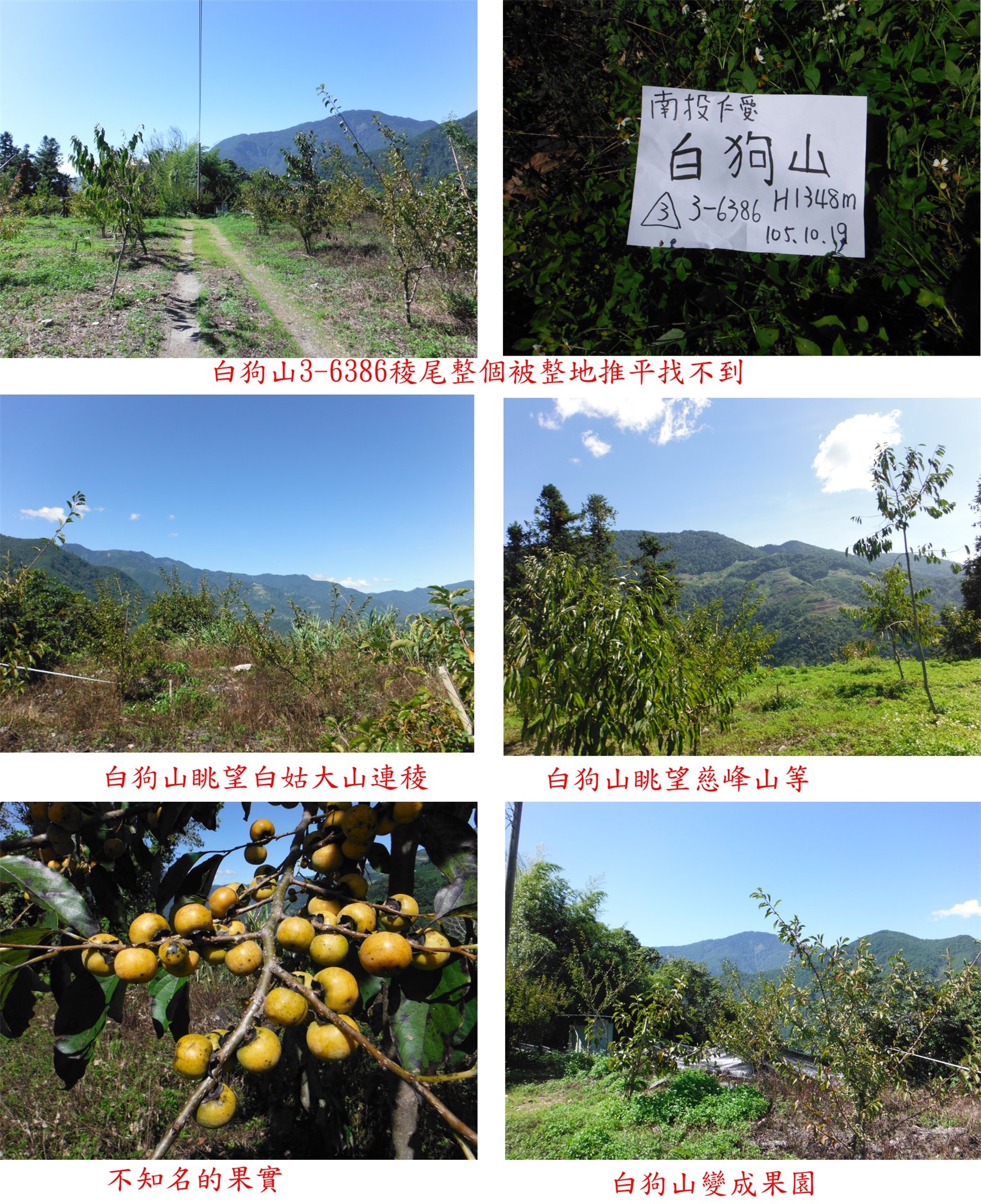 取左繞過鐵門進入開墾地,走50餘公尺即抵達白狗山3-6386點位,眺望白姑連稜與慈峰等山;稜尾整個被整地推平,四周尋找基石是否被推到果園的邊緣,找了15分鐘仍無所獲,失望的離去。