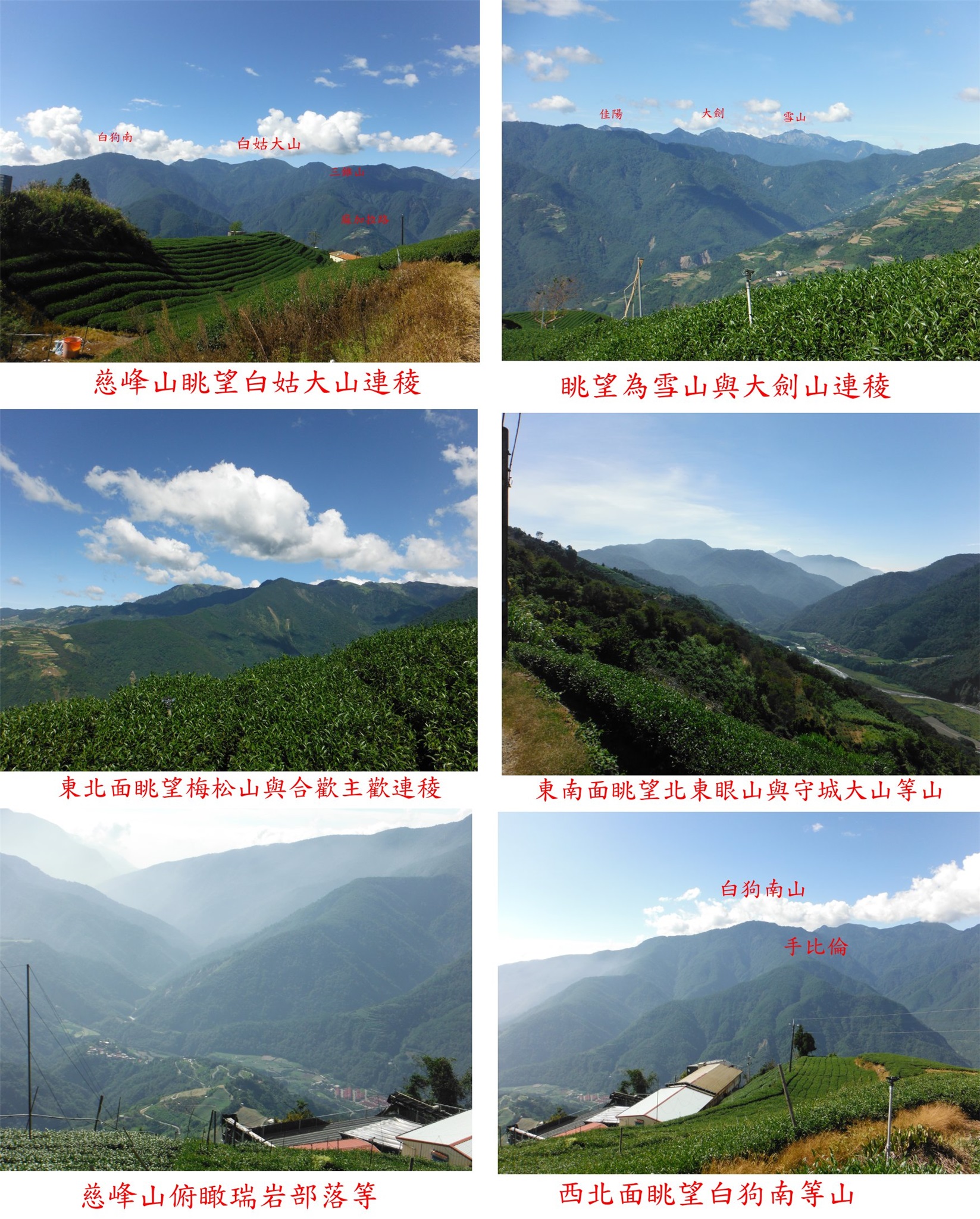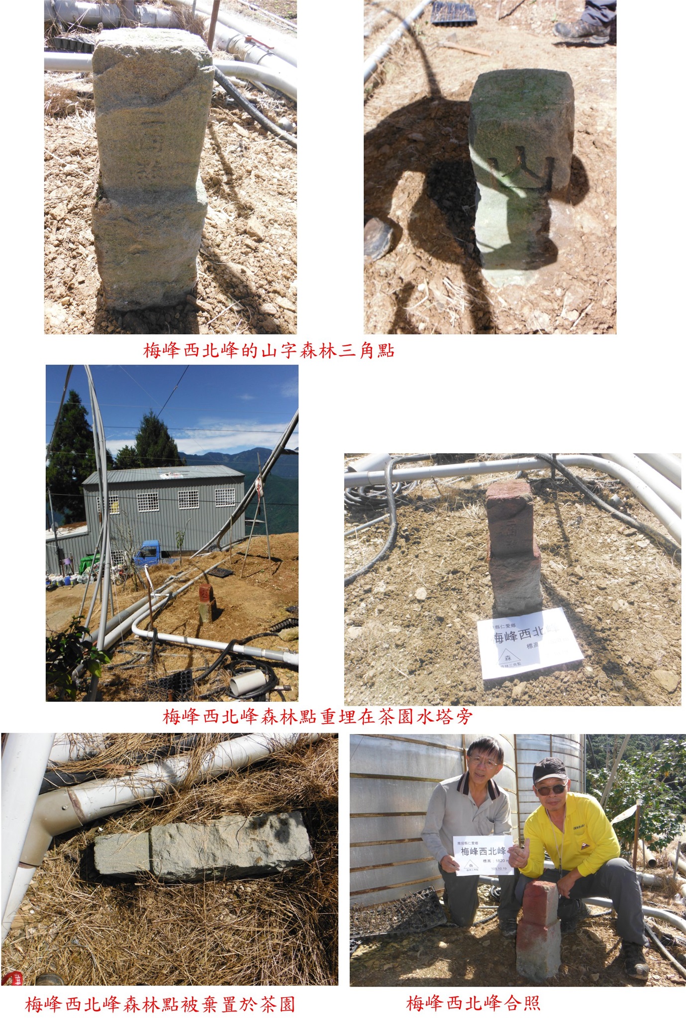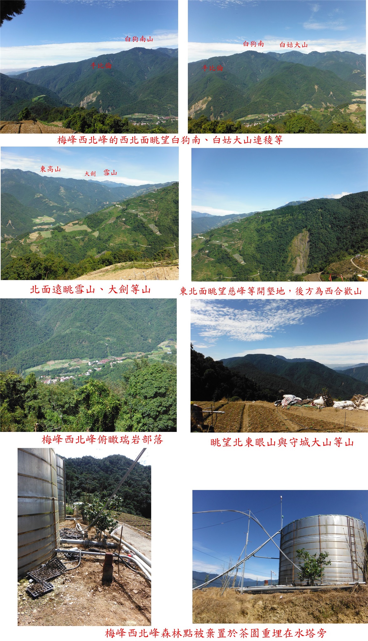 左上稜尾的茶園,基石所在地變成圓形大水塔,四處找不到基石,最後於水塔旁的草叢中找到被棄置的梅峰西北峰森林三角點;上來不用1分鐘,回至農宅借來鋤頭重立在水塔旁靠道路這側,現在明顯好找了,王哥還請屋主好好保護,屋主答應如不妨礙耕作不會移動;茶園視野絕佳,西北面眺望白狗南、白姑大山連稜,俯瞰瑞岩部落等;北面遠眺雪山、大劍等山,東北面眺望慈峰等開墾地,後方為西合歡山。