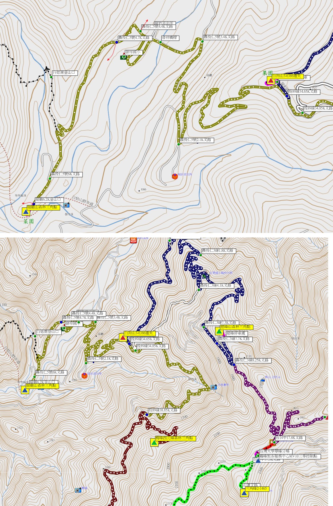 4、白狗山:位於南投縣仁愛鄉,標高1349公尺,三等三角點6386號基石遺失;座標266300 2668736。