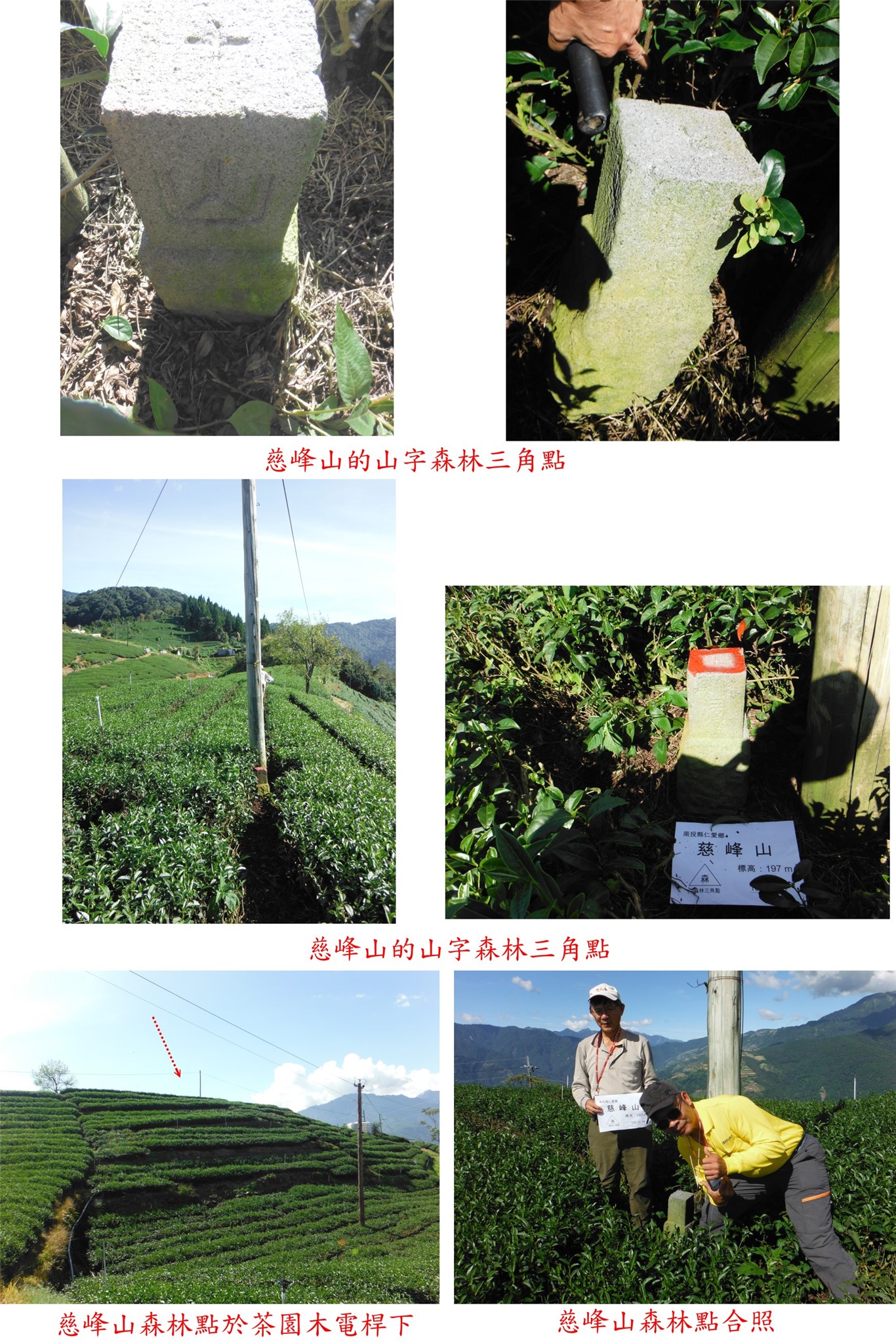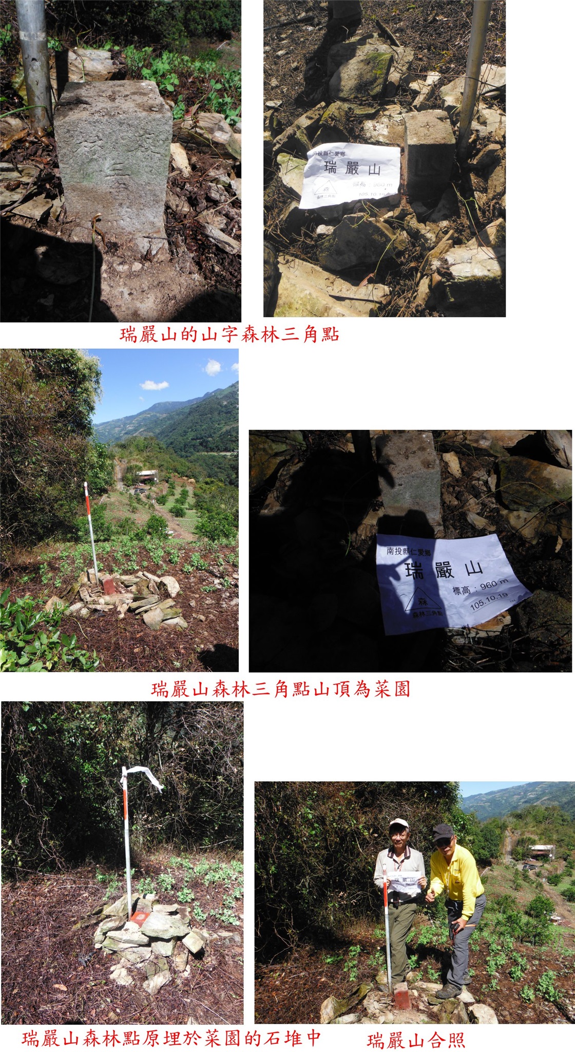10/19約王哥到南投的仁愛鄉撿基石,第1顆的豐林口陸檢8436上回找不到,依山友告知的位置再跑一趟,有可能被廢棄物覆蓋還是沒找到;第2座的梅峰西北峰森林點路程遙遠,基石被棄置於茶園內,找到後重埋於水塔旁、輕鬆入袋;第3座的瑞嚴山森林點有夠深入,基石埋於菜園的石堆中,找很久才找到,上去只要1、2分鐘就可達陣;第4座的白狗山3-6386早已遺失,就在路旁果園內順路再找看看,當然是白費力氣;第5座的慈峰山森林點於茶園內好找,視野超讚值得一遊,上山走6分鐘、也是輕易到手,但路程超遠。