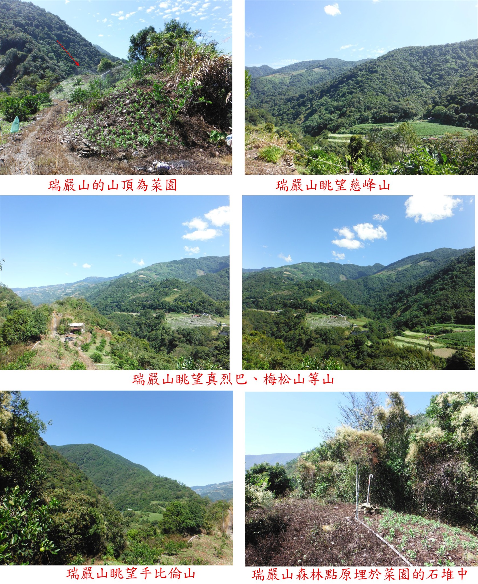 3、瑞嚴山:又稱瑞岩山,位於南投縣仁愛鄉,標高960公尺,森林三角點;座標264395 2667824。