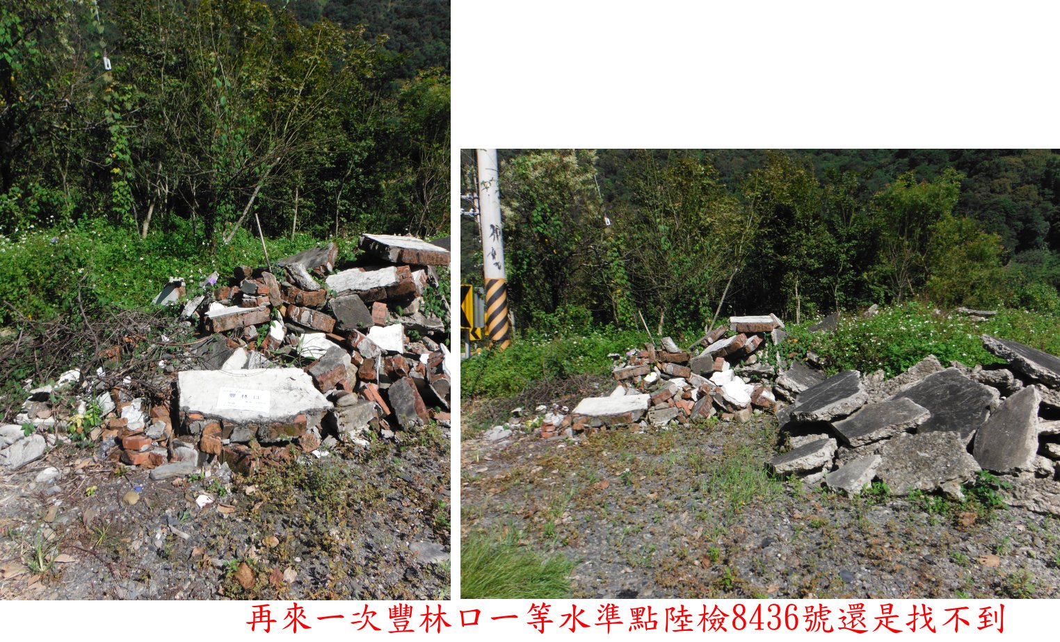 此點上回來時在台14線68.1K處找不到,山友告知可能在67.8K處的路旁,順路特地再來找一次;路左的道路護欄有缺口,路外有一小空地,行前由google街景看過應有一黑色塑膠小水塔,現地貌已改變,小水塔不見了,空地被棄置建築的廢棄物,豐林口陸檢8436號水準點還是找不到,有可能被埋在廢棄物下,第2次還是摃龜,失望的離去。