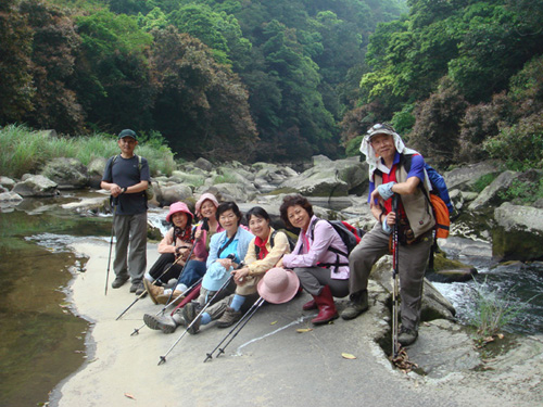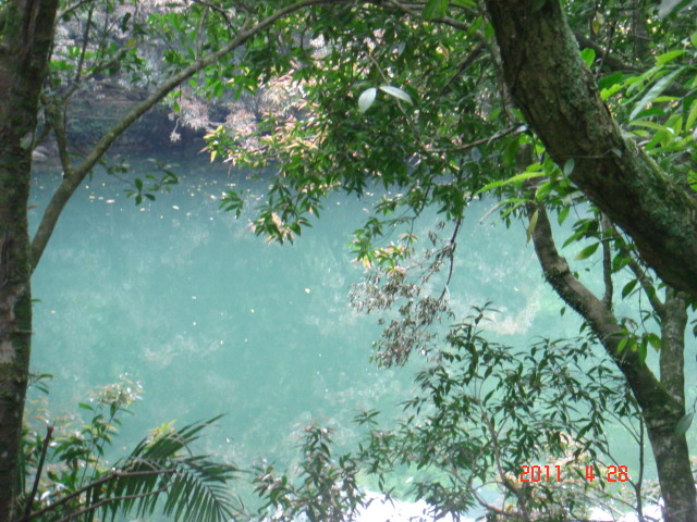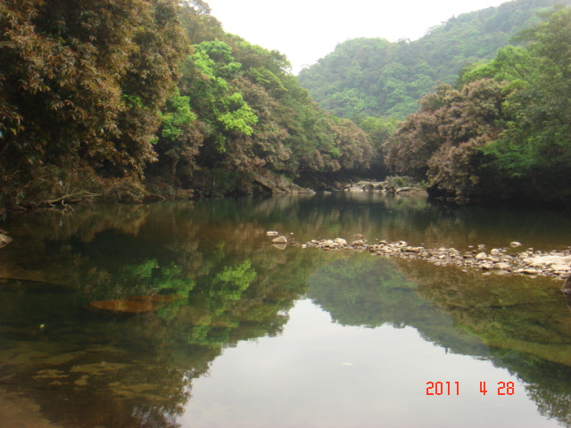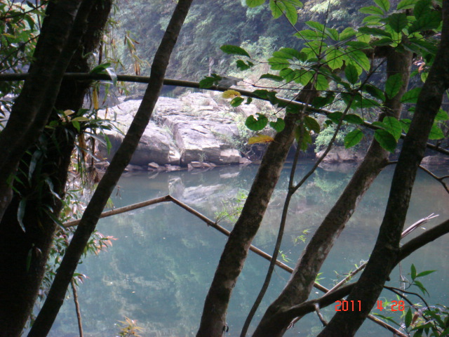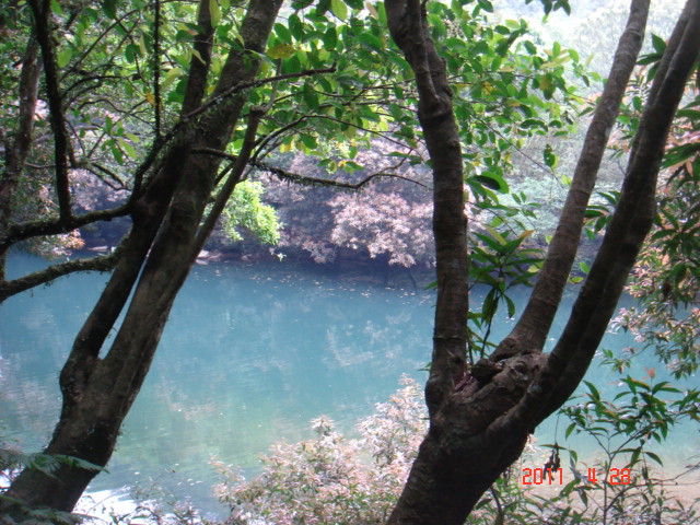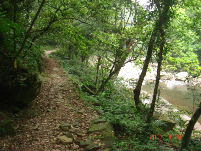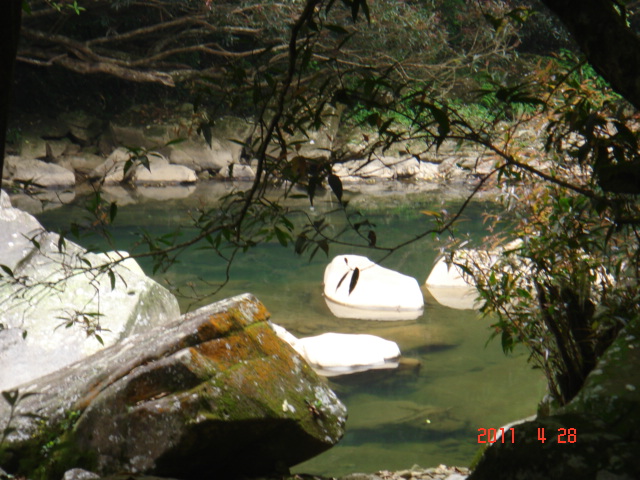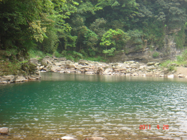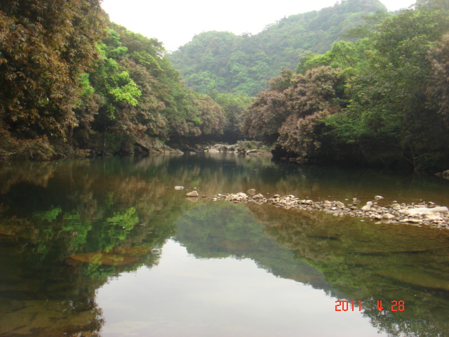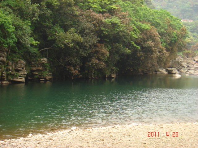 難怪山友们說灣潭古道是條五星級步道。步道既寬敞且平坦,更難得的是蓊鬱山徑上鋪滿厚厚的落葉,行腳其間猶如踩在厚厚絨毯上,走來真是無比的享受,難怪素儒戲稱這是條可以走到99歲的古道。步道旁正是翡翠水庫的水源─北勢溪、灣潭溪。我們今天特地迢迢跋涉來此飲水思源,水庫取名「翡翠」,果其然名不虛傳,上游的北勢溪縹碧如鮮翠玉石,夢潭、雙水潭、土地公潭.比比皆是;有潔白如玉的岩石錯落溪澗,溪畔樹影婆娑掩映,水面如鏡倒影清晰秀麗;水源地護溪有成,苦花魚成群悠游自在;對岸崖壁峭立,有四層稀薄的飛泉流瀑直瀉而下,據松哥說暴雨後來此觀瀑賞潭,簡直是人間仙境!我们美麗的北勢溪比起九寨溝還勝一籌呢!