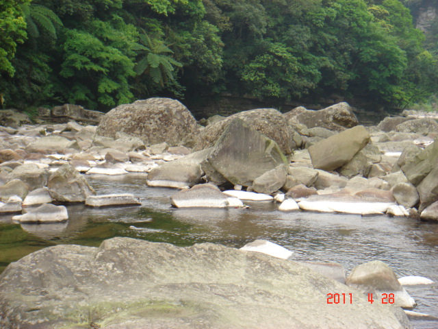 魚兒水中游,游來游去樂趣多。溪中壯闊白石林立石頭,素儒感覺好像就是大江東去裡亂石崩雲驚濤裂岸捲起千堆雪的景象。