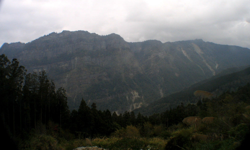 在這邊仰望絕壁上的大塔山山頂,有若天宮堡壘,沿著大路右折續往上繞,坡變陡。