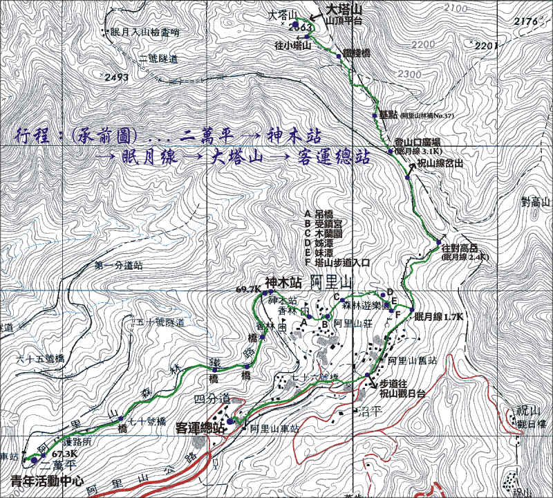 →大塔山(16:44-16:56,2660M)→阿里山客運站(18:20,2170M)