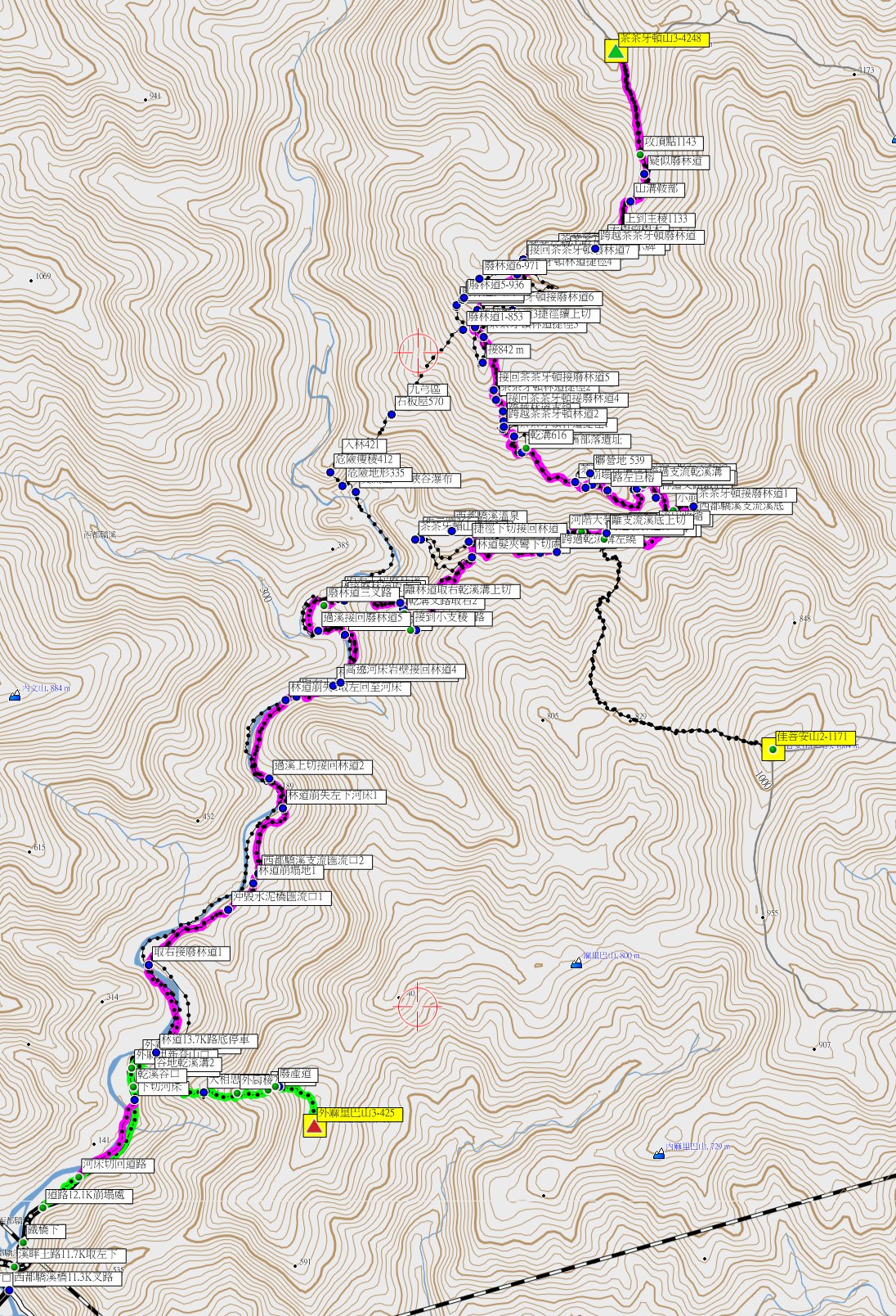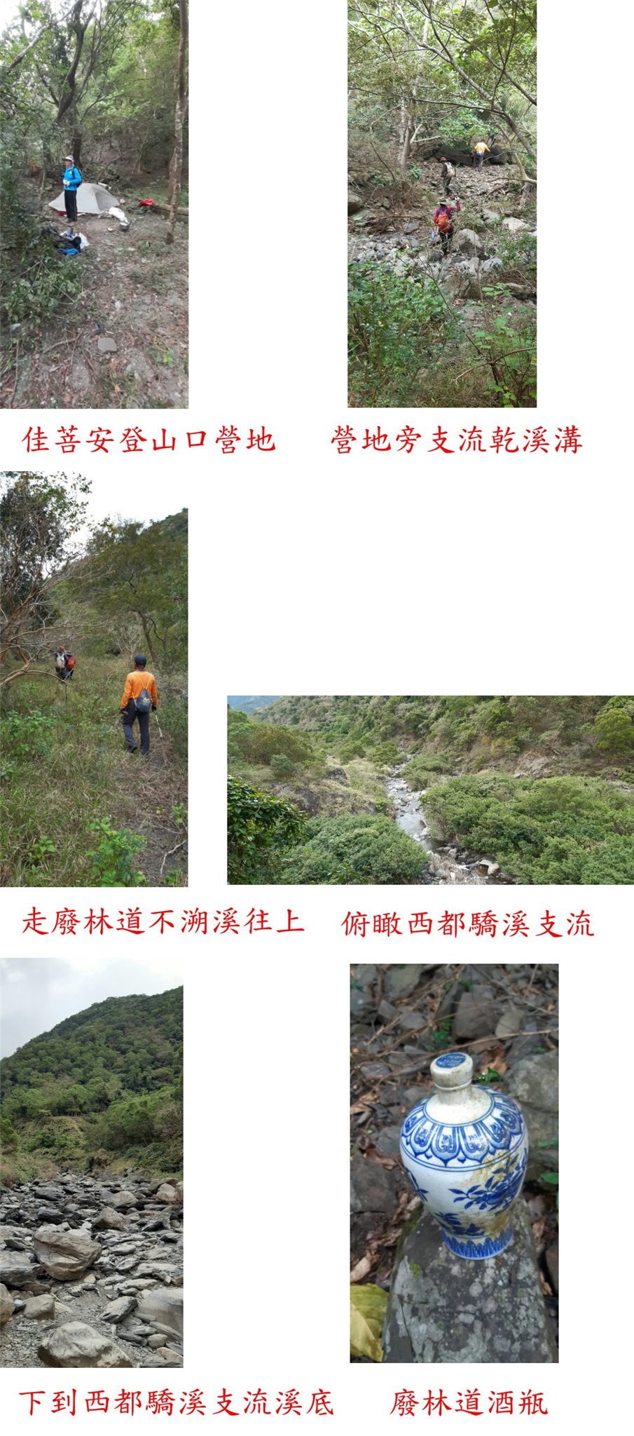 12/31-1/2到屏東走茶茶牙頓與佳菩安等2座山,第一天(12/31)早上先去撿了4顆町杭,再來驅車至林道11.7K路底停車,山友的紀錄都是走溪底,我們先來走一小段西都驕溪底,取右上切廢林道有獵人在利用好走,數度遇崩塌地下繞溪底通過,走4.1K經攔砂壩,續走0.2K離溪取右上,廢林道經鐵皮工寮走約1K,取右乾溪溝上切碎石坡地形陡峭重裝非常難走,接到林道最高點路轉下坡抵達分支流的河階大營地,此段路重裝走了5小時又5分鐘;山友建議改到菩安山登山口的河階地營地紮營,此段路走了近半小時,此營地平坦且避風水源也近不錯的營地;今日重裝走了9K、累計爬升