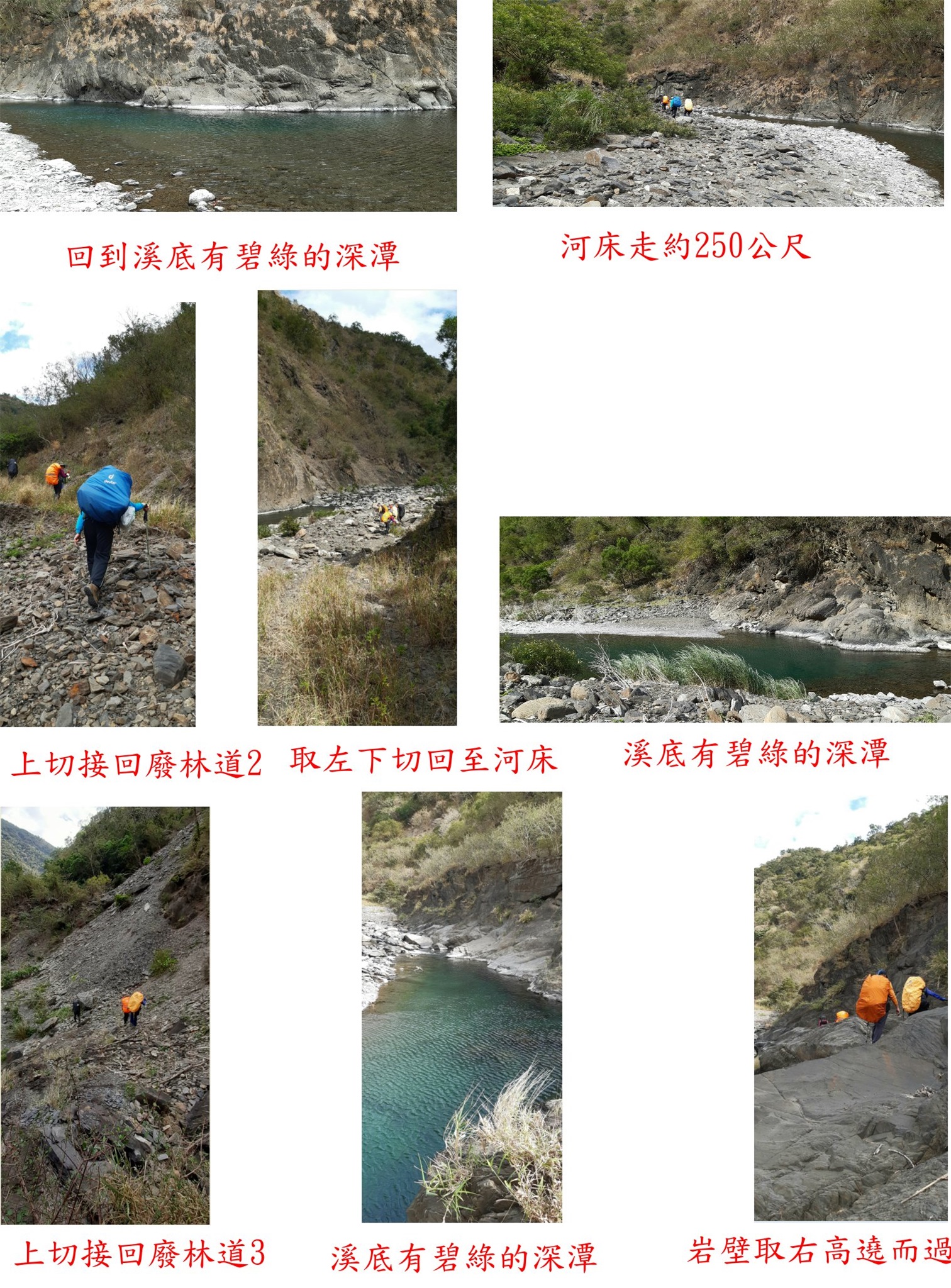 11:42前方林道崩失1,取左下切回至河床淺灘過溪至左岸,溪底有碧綠的深潭,河床走約250公尺。