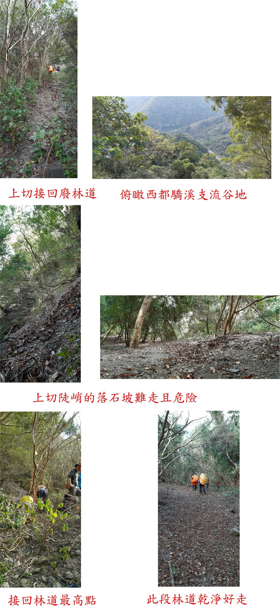 13:44水泥路基前林道崩塌,高325公尺,取右乾溪溝上切,陡峭的落石坡難走且危險,2處乾溪溝叉路均取右行,碎石坡地形山友綁有細繩,重裝很難走於此耗費不少時間。