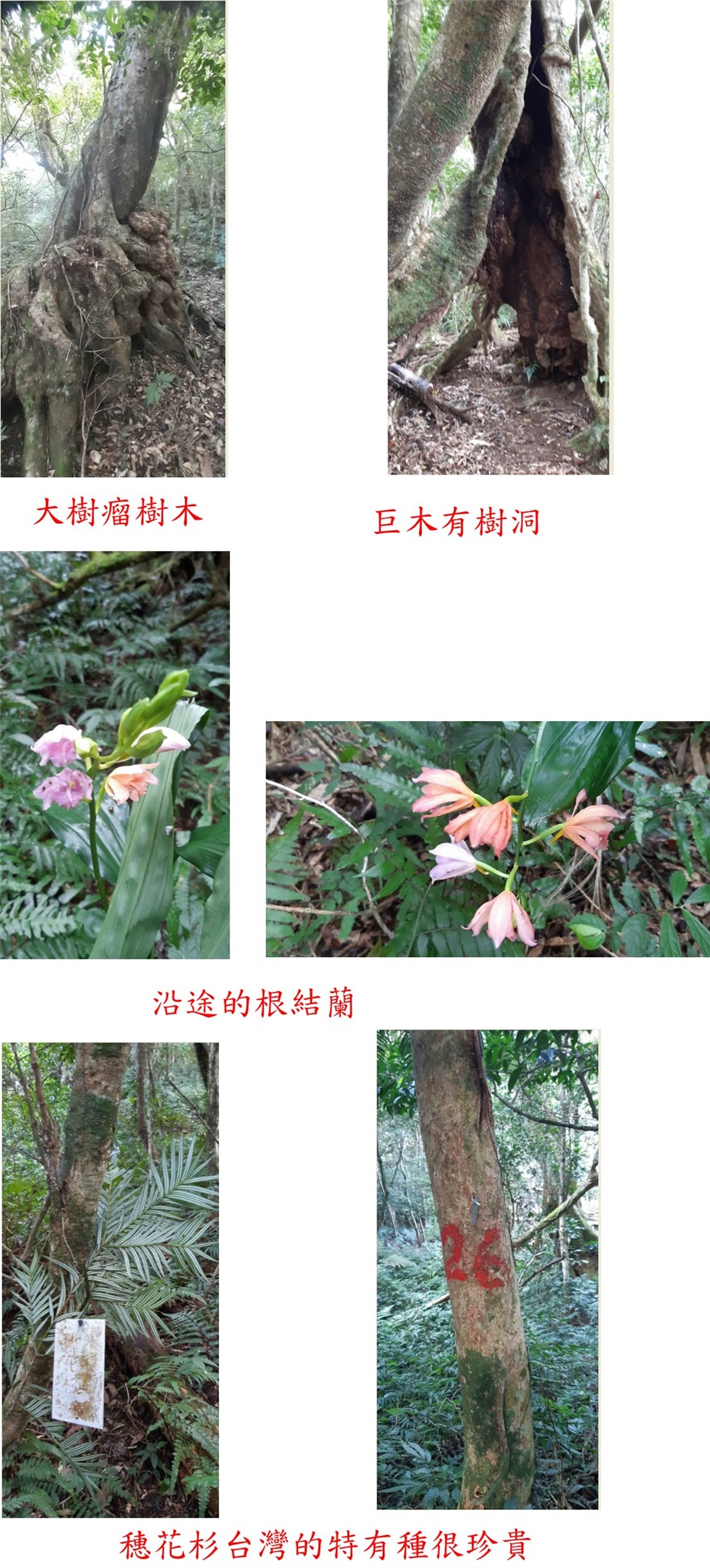09:50大樹瘤樹木,山徑腰繞過1159山頭,開始出現穗花杉,台灣的特有種很珍貴,林務局有噴漆保護;前方有棵巨木有樹洞,稜線有許多巨木。