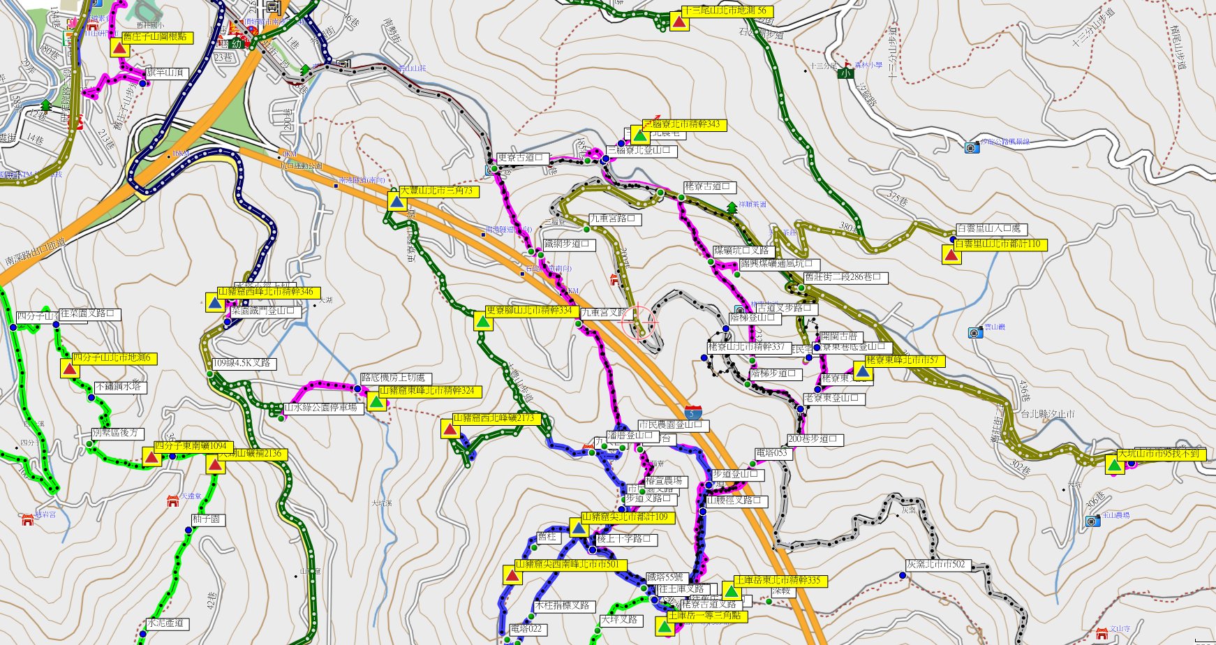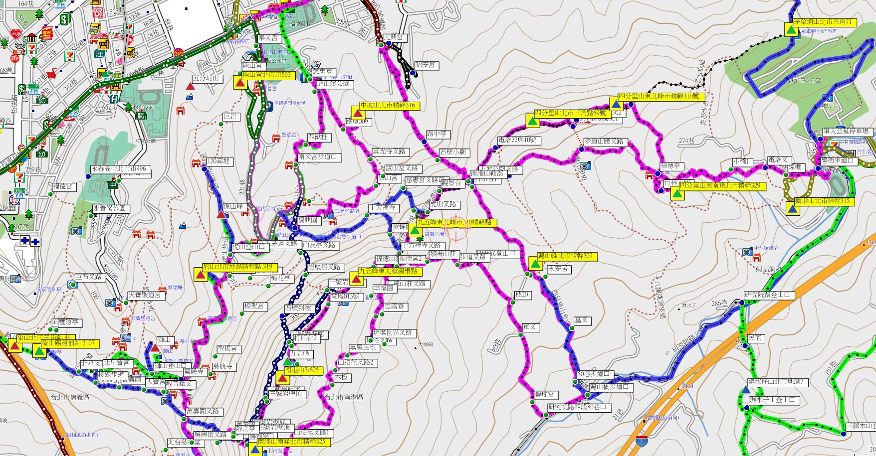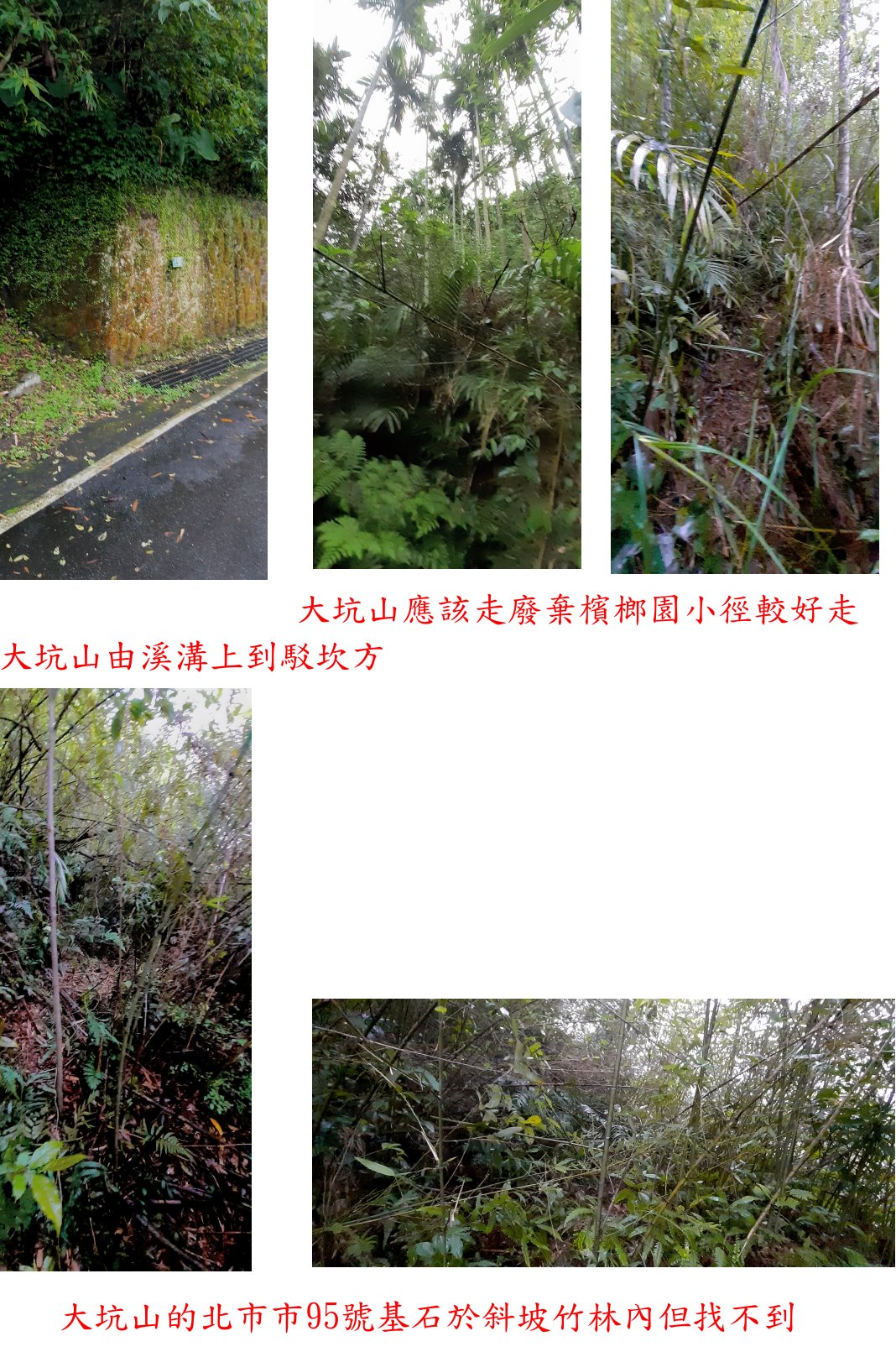 5、大坑山:位於台北市南港區,標高144公尺,北市市95號基石;座標3147232769169。過舊莊路二段306巷右側山坡,從"大豐幹76"電桿與山溝旁路徑上