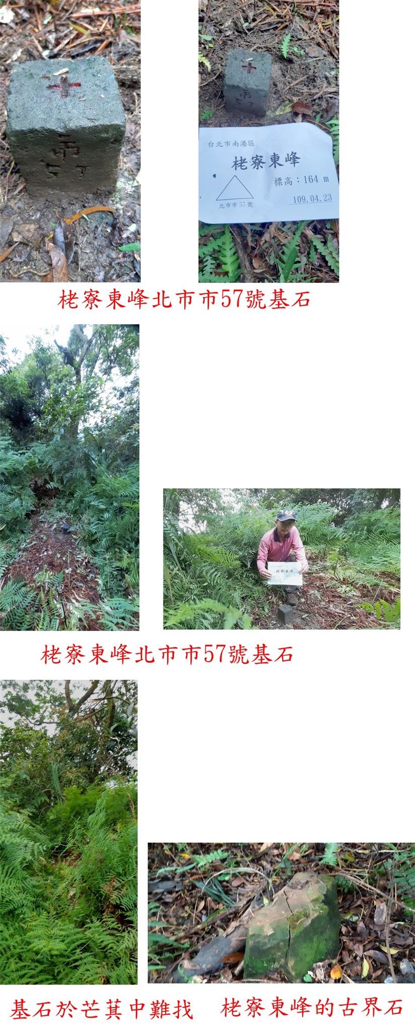 4/23閒來無事下午去南港地區找幾顆台北市埋設的基石,首先去撿南港山連稜上的四分里山北市三角69號,由北興宮走步道上到南港山鞍部,再順稜登上四分里山,山頂有絕佳視野,此山早年即已來過,上山走半小時;第2座為四分里山東峰北市精幹310號,順稜續走10分鐘即抵達,比對南港山連稜山頭就漏掉此點特別來補,山頂展望亦佳,再來走山徑下切到中華科大上來的步道回到北興宮,連登2座山繞一圈費時1小時又38分鐘;第3座為三腦寮北峰北市精幹343號,由舊莊街二段187巷進入有座古樸的橋樑,山徑走6分鐘即抵達,基石於菜園內;第4座為栳寮東峰北市市57號,由舊莊街二段286巷巷底古厝起登,路況佳的保線路走10分鐘即抵達,基石於電塔旁的芒萁中不好起,努力砍終於尋獲基石,還找到一顆古界石;第5座為大坑山北市市95號,就在舊莊街路旁駁坎上方直線距離只有50餘公尺,沒路要砍走了10餘分鐘方抵達,點位於竹林內的斜坡上埋的位置很奇怪,找了33分鐘仍摃龜,回程改走檳榔園舊徑好走多了;今日下午找了5顆基石,只有3顆新的基石入帳。
