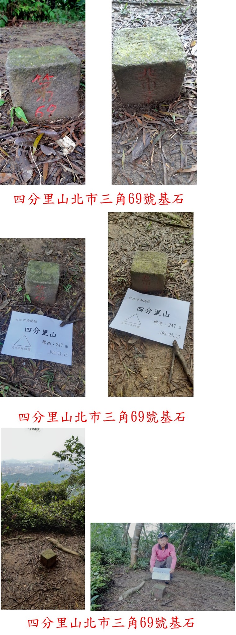 1、四分里山:位於台北市南港區,標高247公尺,北市三角69號基石;座標3094252769981。