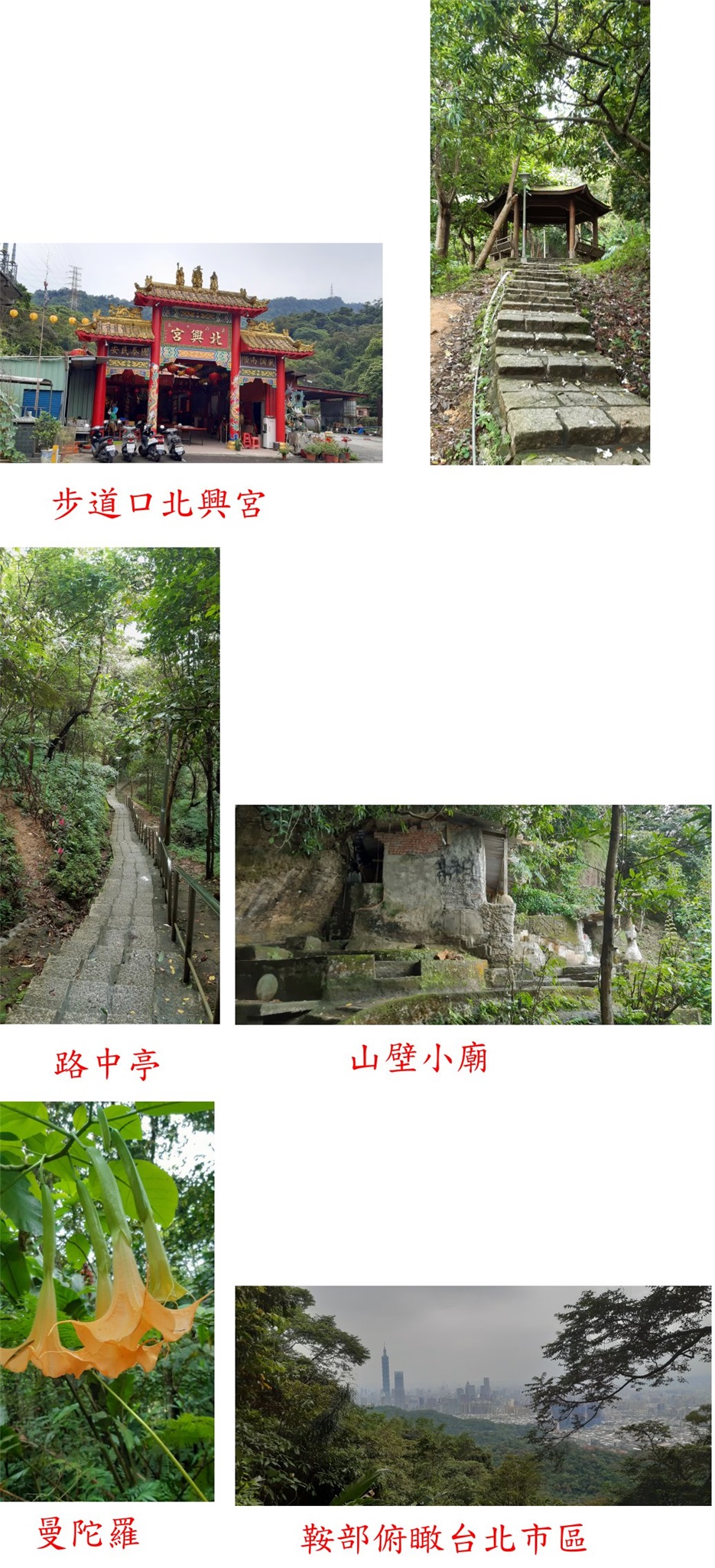 由北興宮旁登山口走步道上山,經路中亭與山壁小廟走約