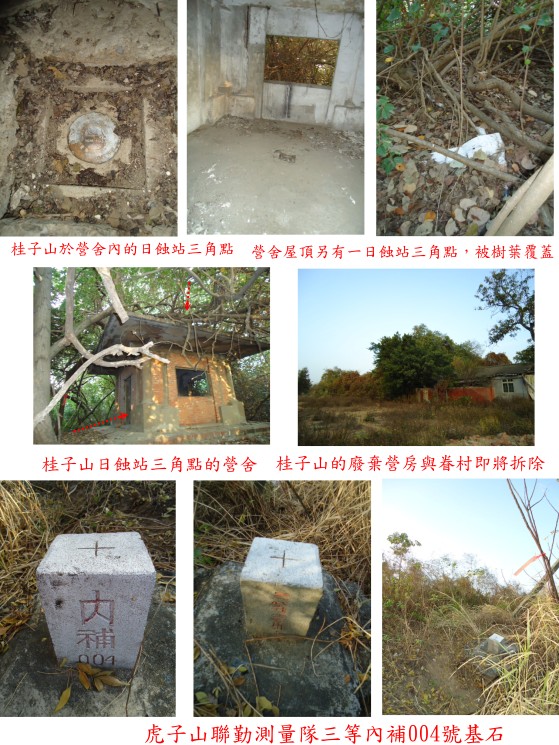 由舊台南市政府走南門路,過健康路口約4百公尺,右側即桂子山;舊時係由南門路7巷進入眷村,於1/4桂子山的廢棄營區圍上圍籬,連南側的眷村亦有圍籬;先翻牆進入即將拆除的舊眷村,再翻過高的鐵片圍籬,進入廢棄營區;由磚造營舍後方循有路條的小徑上土丘;高點有一的營舍,進入室內中央有一四方形的凹槽,蓋子已拆除,即可見到桂子山日蝕站三角點銅標;依資料屋頂另立有一日蝕站三角點銅標,由樹幹勉強爬上屋頂,堆滿好厚的落葉,見到測量的塑膠布,懶的逐一翻找,小心下來;桂子山日蝕站即將改建,不知是否會保留?有興趣的山友趕快去。
