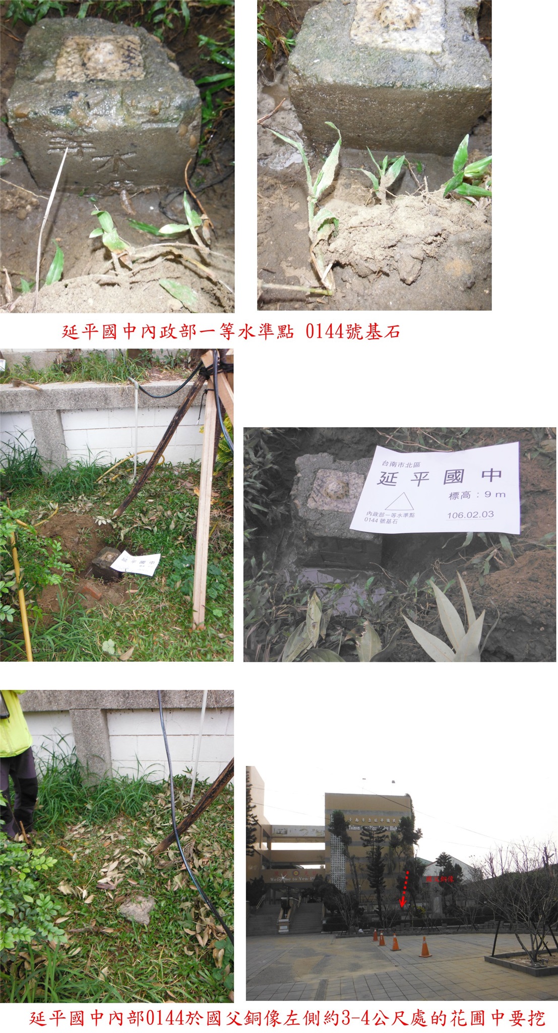 3、延平國中:位於台南市北區,標高9公尺,內政部一等水準點 0144號基石;座標168256 2545714。