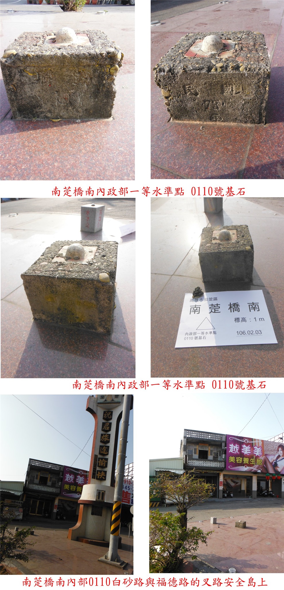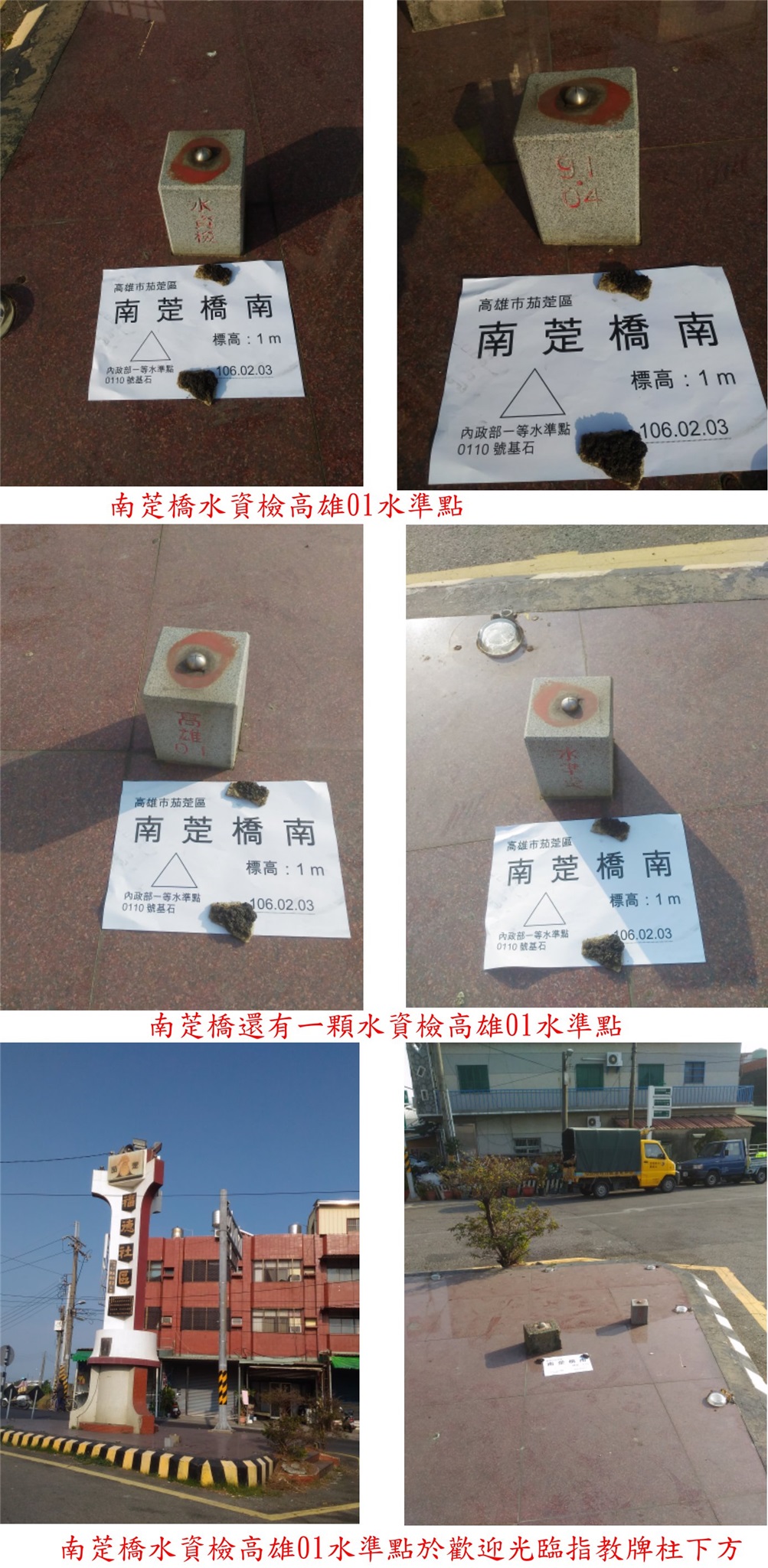 4、南萣橋南:位於高雄市茄萣區,標高1公尺,內政部一等水準點 0110號與水資檢高雄01水準點;座標1165570 2535456。