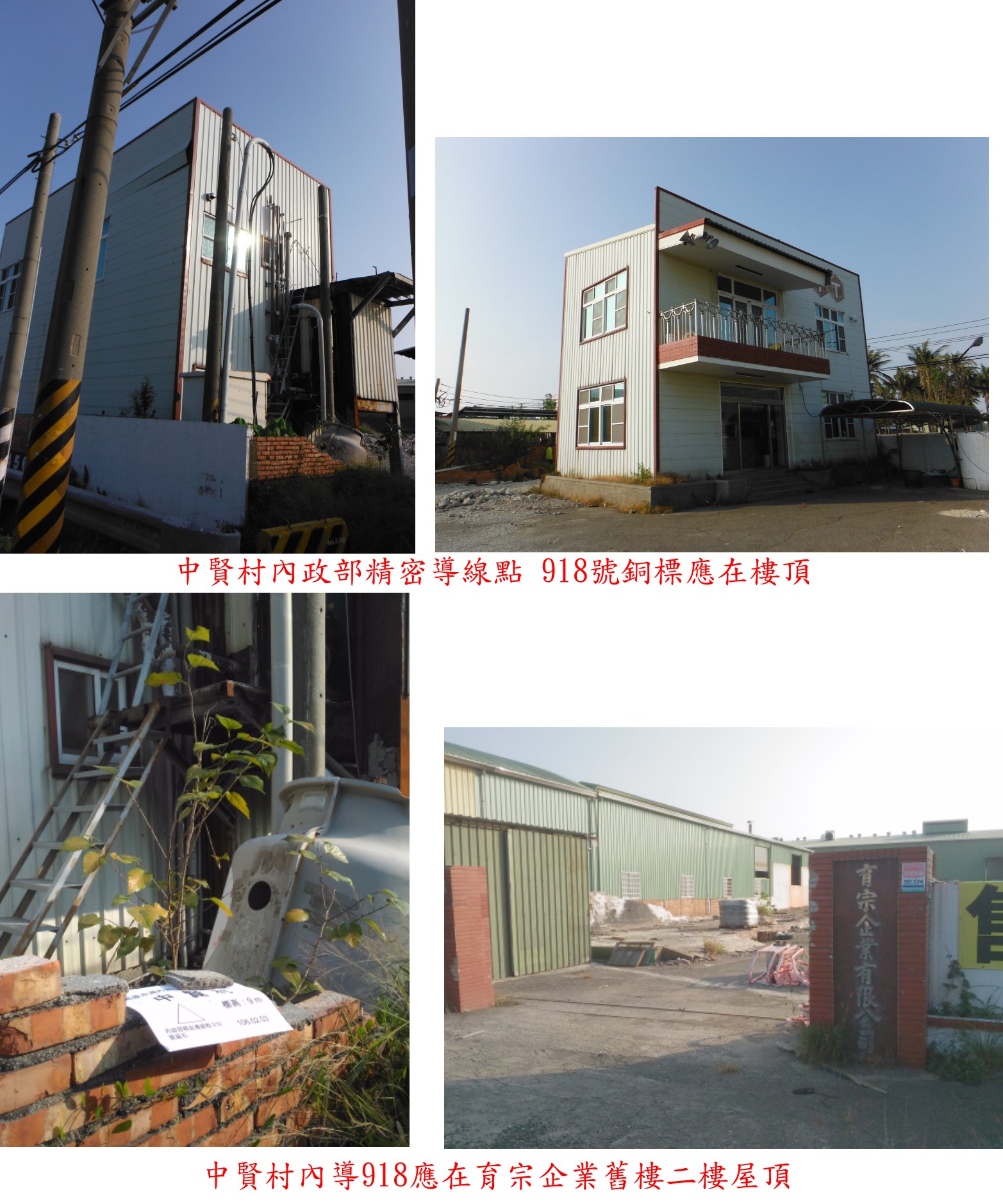 公司的廠房已拆除,資料述明於「育宗企業舊樓二樓屋頂西側水泥水塔邊」,即於大門口右側辦公室的二樓頂,人去樓空且有上鎖無法上樓查看中賢村內導918號銅標是否尚存?