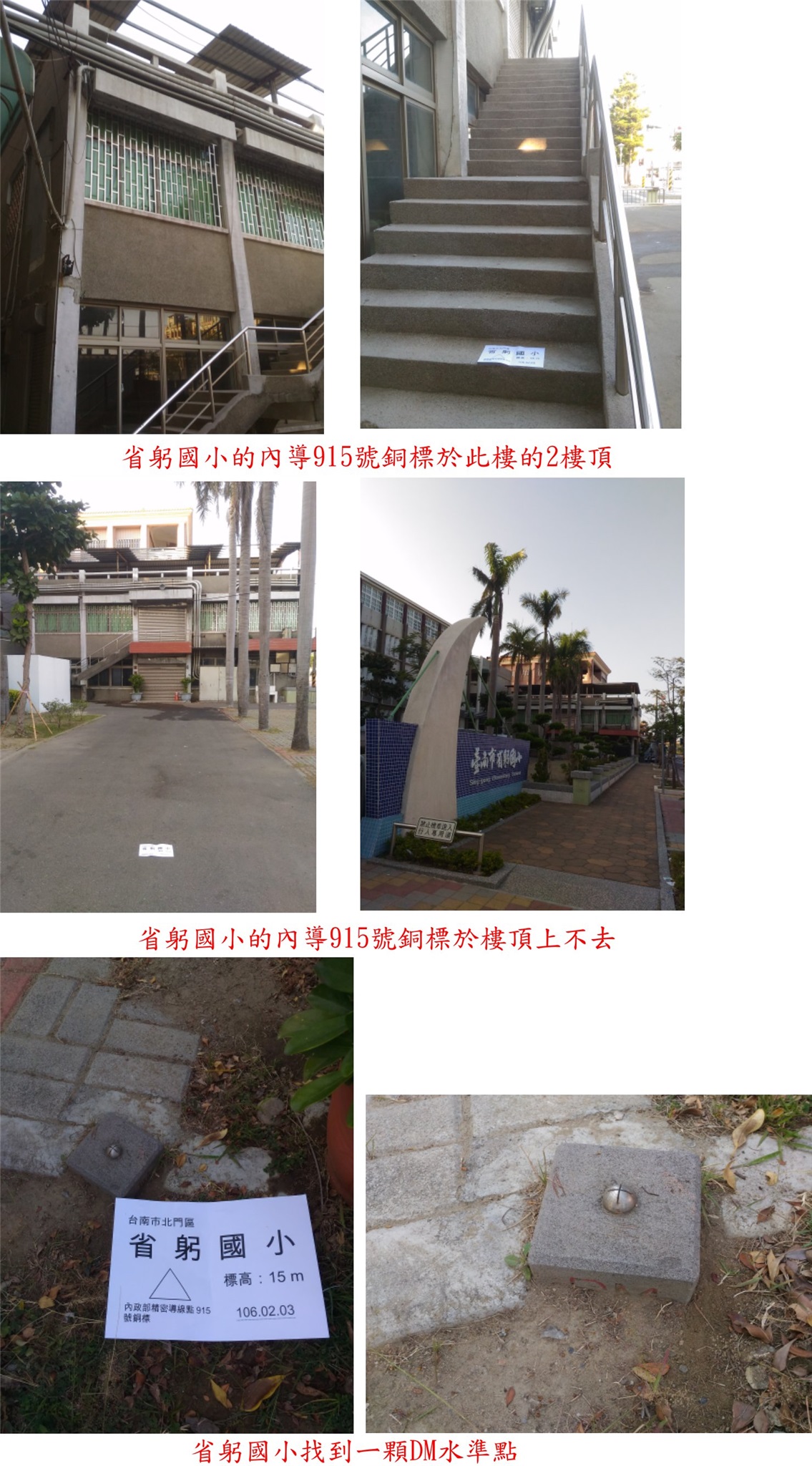 6、省躬國小:位於台南市南區,標高15公尺, 內政部精密導線點 915號銅標;座標165072 2537298。
