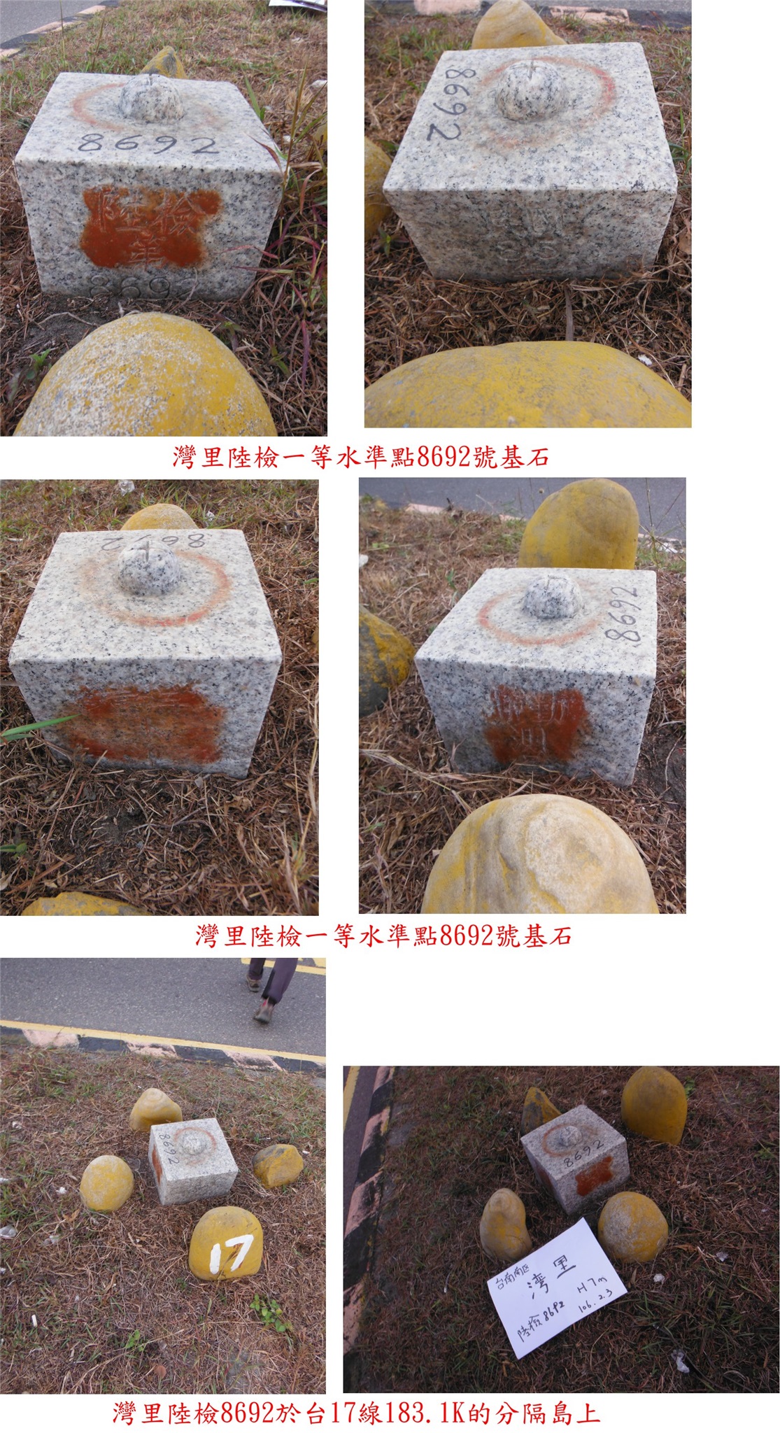 灣里陸檢8692號水準點於台17線183.1K的分隔島上,靠近巷口處明顯好找,此點聯勤測量隊亦立於民國85年。