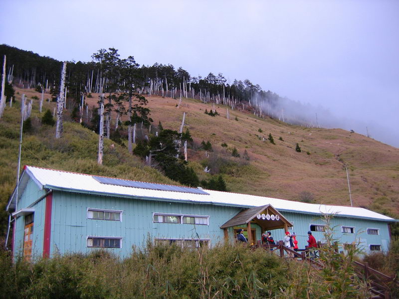 也不記得是幾點鐘,一票人起來準備吃早餐摸黑出發上雪山了,於是我也跟著起來看看,出369山莊一看,阿咧,天空無星子,且有點飄小小雨,地面也濕濕的,我看還是算了,跟著徐大哥他們走,應該比較有搞頭。由於睡很飽了,也不想那麼快回到睡袋睡覺,所以決定先吃吃早餐,呼吸一下冷冽的空氣,應該也不錯。於是拿出我的爐頭&鋼杯,泡了一杯熱咖啡,吃著我的麵包與巧克力、餅乾等,吃的暖暖的,真舒服,人一吃太飽就似乎想睡覺,鑽回睡袋的同時,從窗戶目送著一盞盞亮起的頭燈,他們往雪山主峰出發了...。