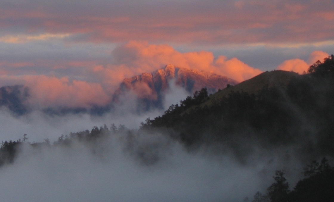 前一晚聽說有隊伍今天也是要摸早黑上雪主,我又在暗想,到時也跟著起床看看,如果天空有星子,那就在跟著上雪主好了,不過事與願違,天候依舊不佳,山頂即使能上去應該也無展望,於是又回去睡回籠覺,近早上6點時,往窗外一看,發現有紅霞,趕緊下床拿相機出去拍照,不過,只是曇花一現而已,很快就被雲霧沒了,倒是從廁所看369山莊不錯看。
