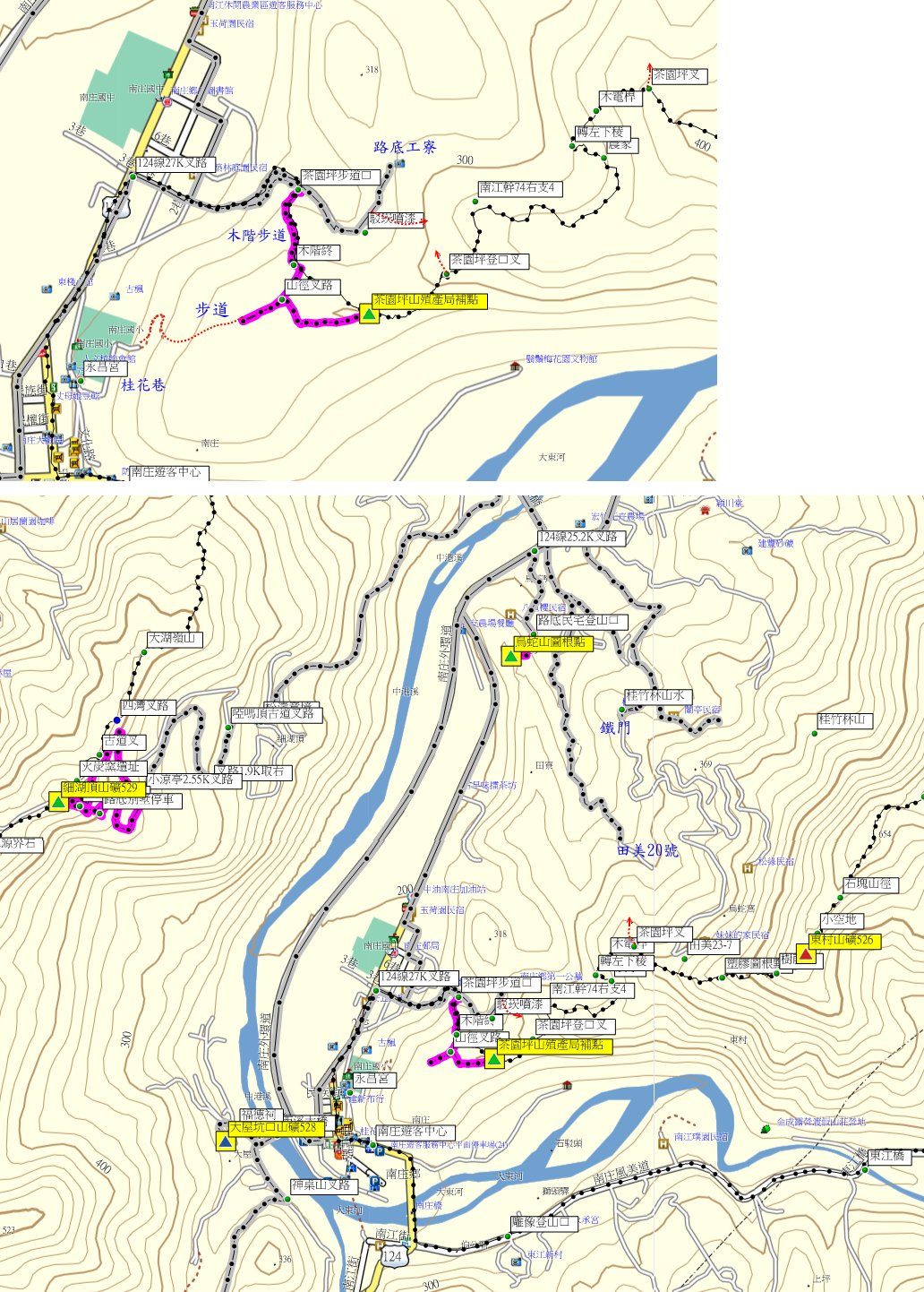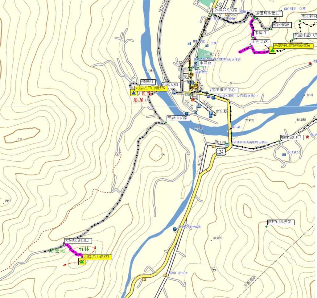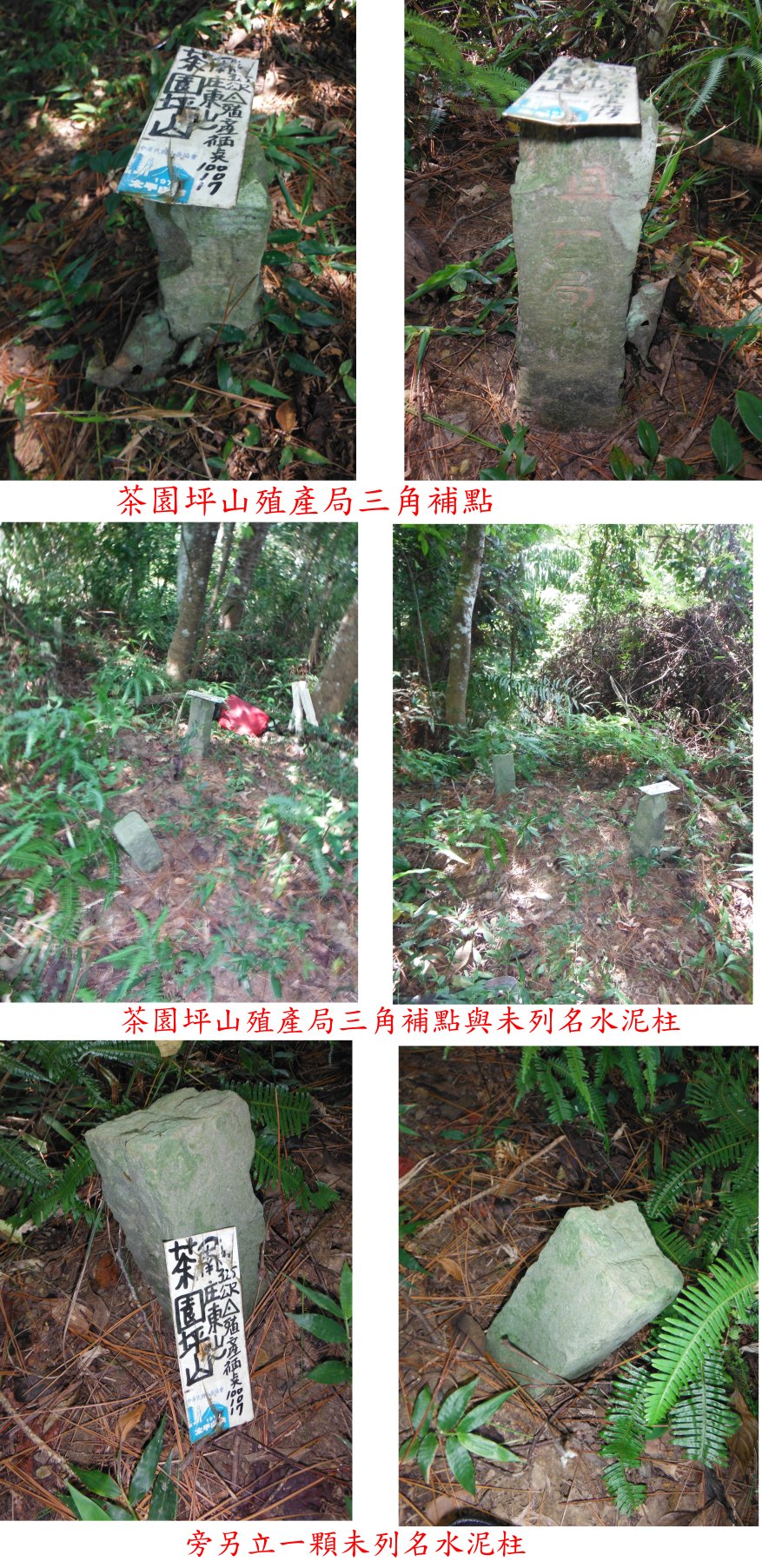 1、茶園坪山:又稱石駁頭山或北南庄山,苗栗縣南庄鄉,標高320公尺,殖產局三角補點。