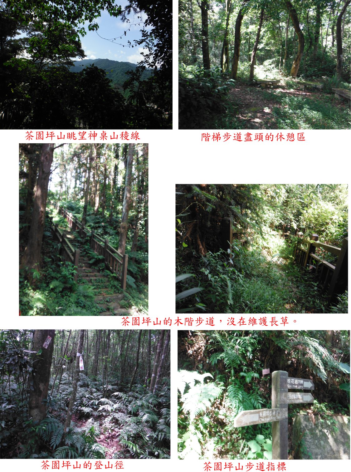 取右木階步道上行,沒在維護長草,階梯步道走4分鐘接山徑,續往桂花巷另一步道口方向走約80公尺叉路,往茶園坪山應左入登山徑,入口有指標;未留意續往前走路轉緩下、發現有誤折返,左入山徑、有稀疏路條,走6分鐘抵達茶園坪山;有顆殖產局三角補點,旁另立一顆未列名水泥柱,山頂於林間無展望,往東村山無明顯山徑;上山走14分鐘,此山返往費時32分鐘。
