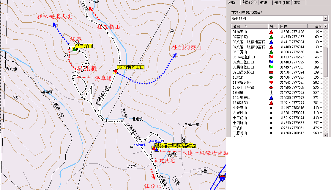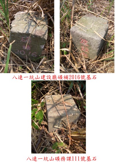 3、八連一坑山-位於台北縣汐止市,標高38公尺,有一顆礦務課111號基石,GPS(314400 2776014);另有一顆建設廳礦補2016號基石,GPS(314417 2776004)。