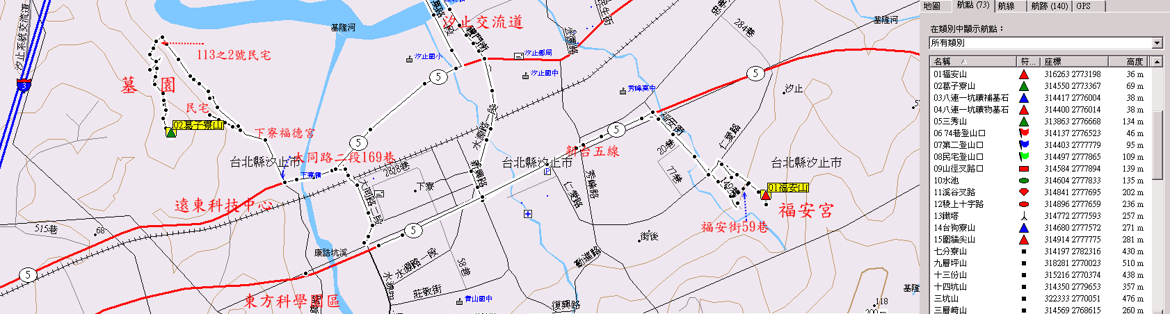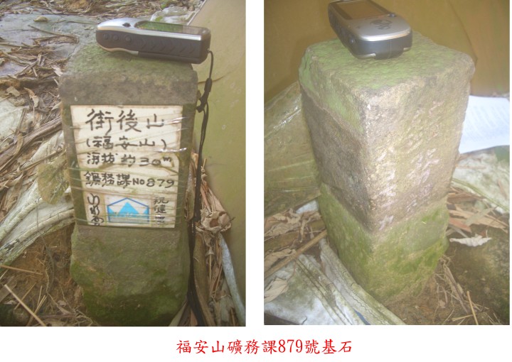 1、福安山-又稱街後山,位於台北縣汐止市,標高36公尺,有一顆礦務課879號基石,GPS(316270 2773193)。