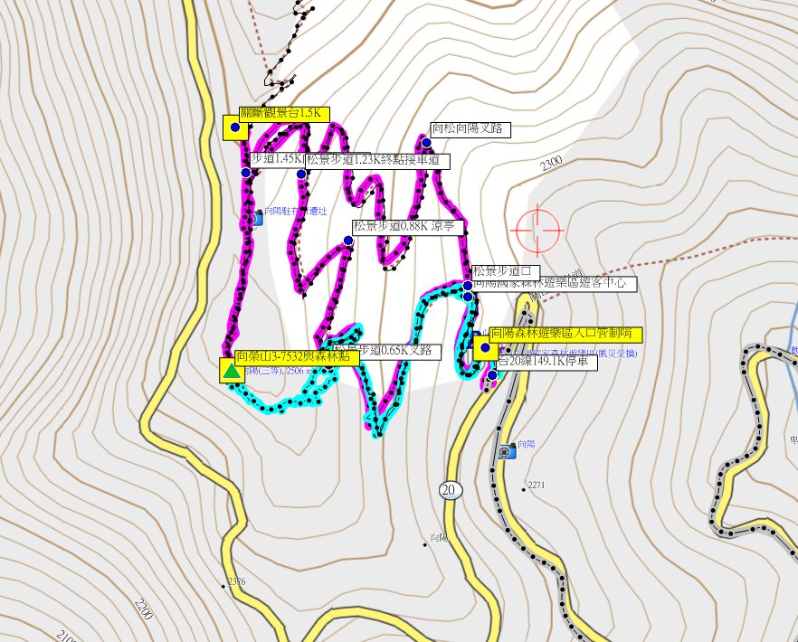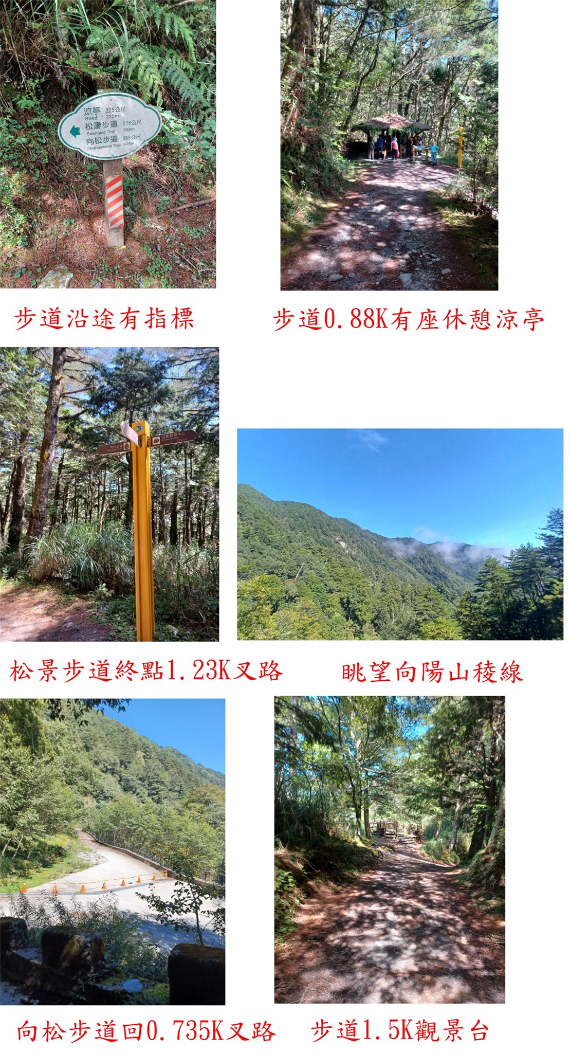 向陽國家森林遊樂區有向陽步道、向松步道、松景步道、松濤步道及松楊步道等5條步道,此行走松景步道接松濤步道至步道1.5K的觀景台,觀賞關山大斷崖,再來順道去走向榮山,有3-7532與森林三角點等2顆基石;回程改走向松與向陽步道回,停留時間為1小時又50分鐘。