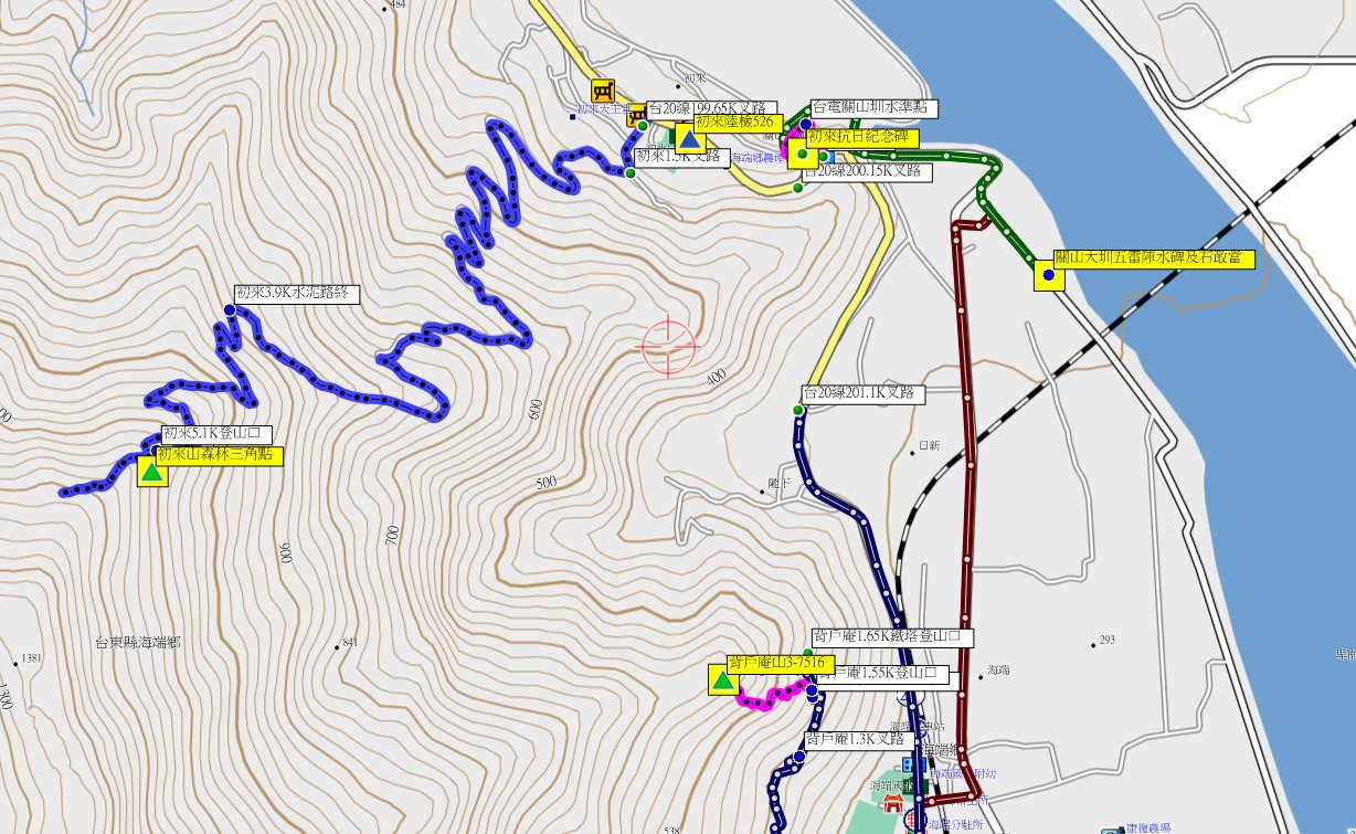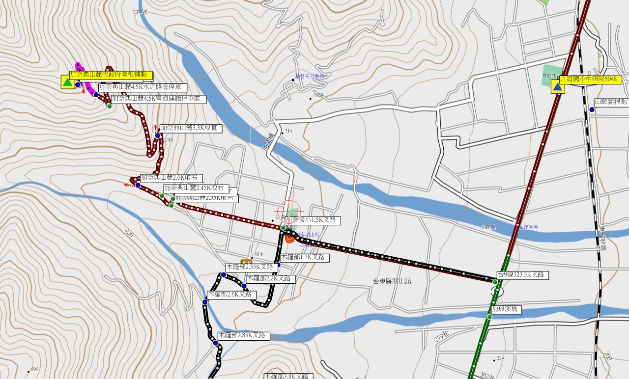 清晨由關山市區走太9線南行走5.6K叉路(323.3K處)【0K】,右轉東28-1線往加拿部落走1.5K加拿國小叉路;取右隨即左轉至2.3K叉路,左轉走40餘公尺隨即右轉至2.6K叉路,取右上坡小水泥農路至3.3K叉路,續行至4.5K水泥路底停車;高