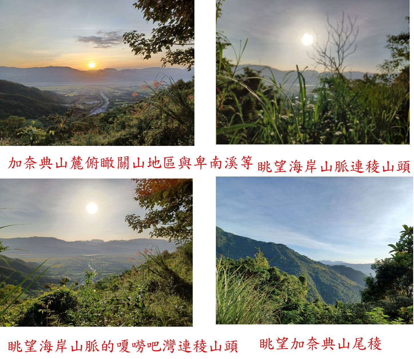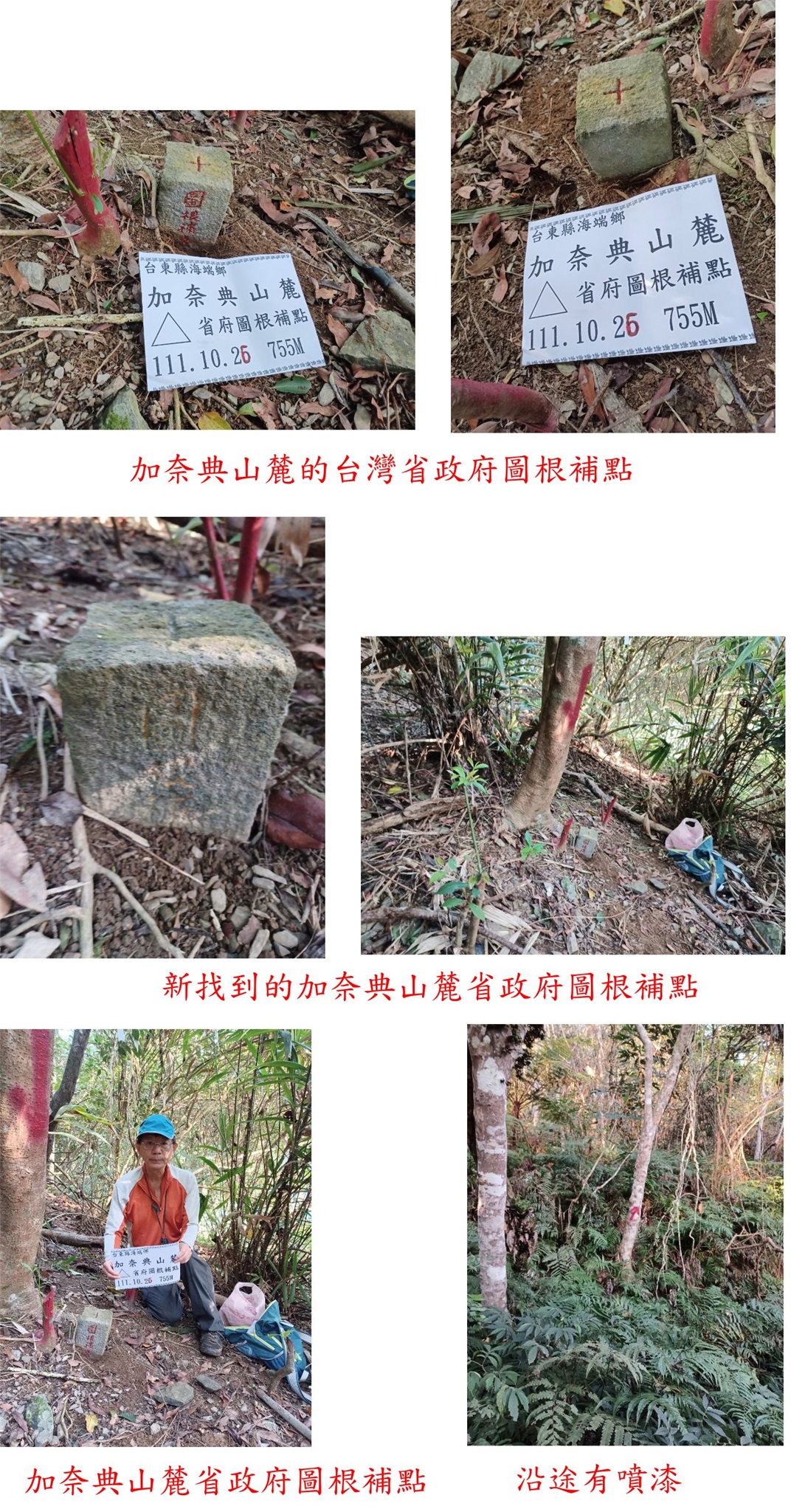 1、加奈典山麓:位於台東縣海端鄉,標高755公尺,台灣省政府圖根補點;座標261062 2545505。