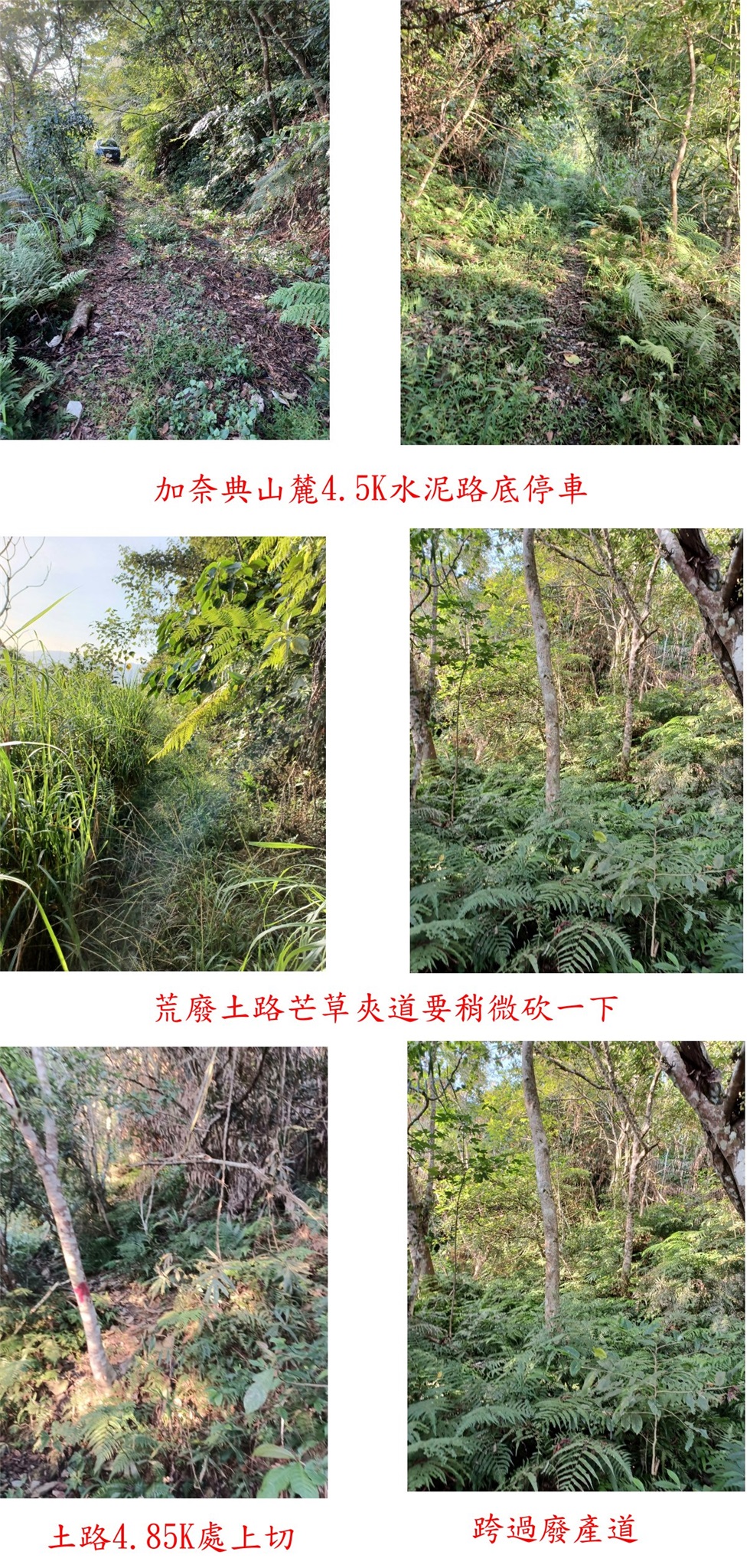 走土路上山芒草夾道要稍微砍一下,土路走約0.35K(4.85K處)上切處,取右跟隨噴漆上切,走20餘公尺跨過廢產道;一路拉樹根陡上走約