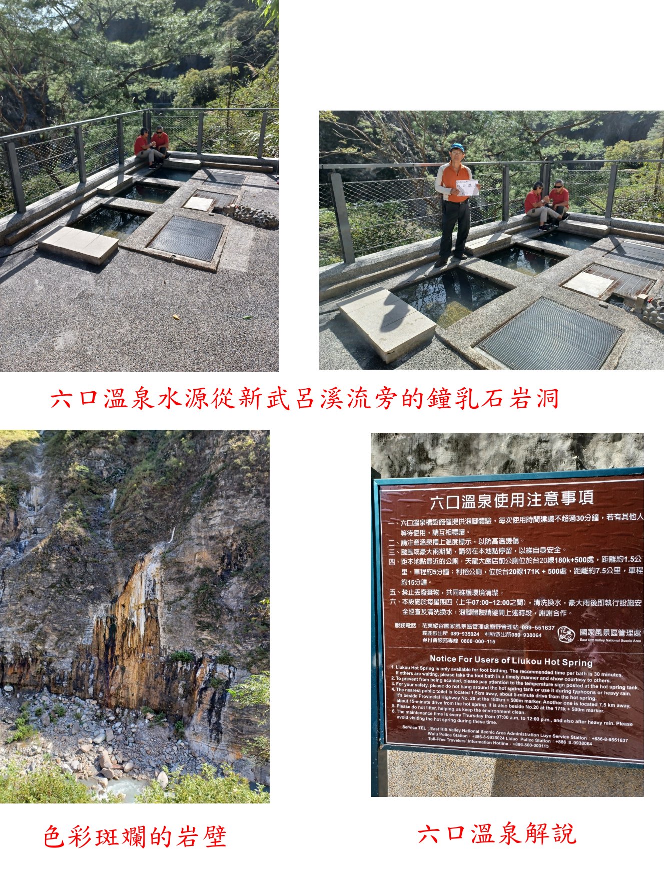 六口溫泉水源從新武呂溪流旁的鐘乳石岩洞或是自溪床冒出,為野溪溫泉,引溫泉水至路旁有六個小格,適合泡腳或煮溫泉蛋。