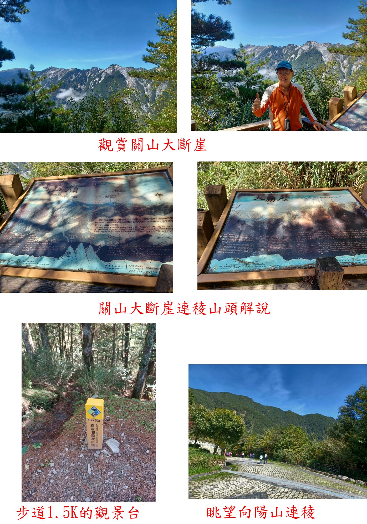 遊樂區大門口有棵紅楓遊客排隊拍照,大門口管制哨登記後進入向陽步道走約0.25K,取左階梯路的松景步道上行,途中0.88K有座休憩涼亭,續行至松景步道終點1.23K;取左松濤步道走0.35K至步道1.5K的觀景台,觀賞關山大斷崖,自自向陽大崩壁至關山北峰連綿十餘公里的斷崖地形,眺望關山、鷹子嘴與塔關山連稜的山頭;原路回到步道1.45K彎道即向榮山登山口,沿途無路條自行覓路,順稜緩下至鞍部轉緩上;接近山頂時路況轉佳且開始出現路條,順稜走約