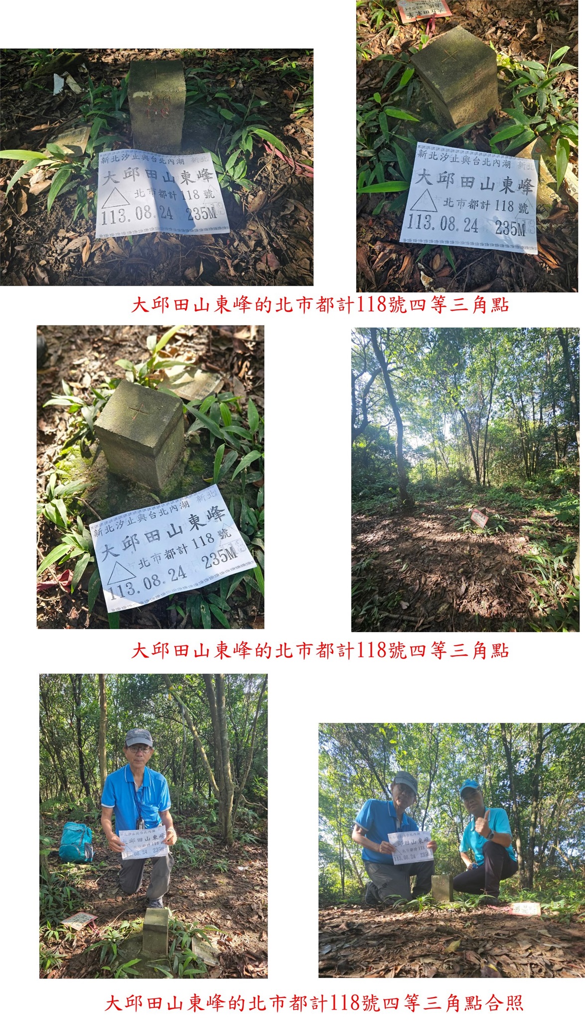 1、大邱田山東峰:也稱大邱田山東南峰,位於台北市內湖區與汐止市交界處,標高235公尺,北市都計118號四等三角點;座標310769 2777752。