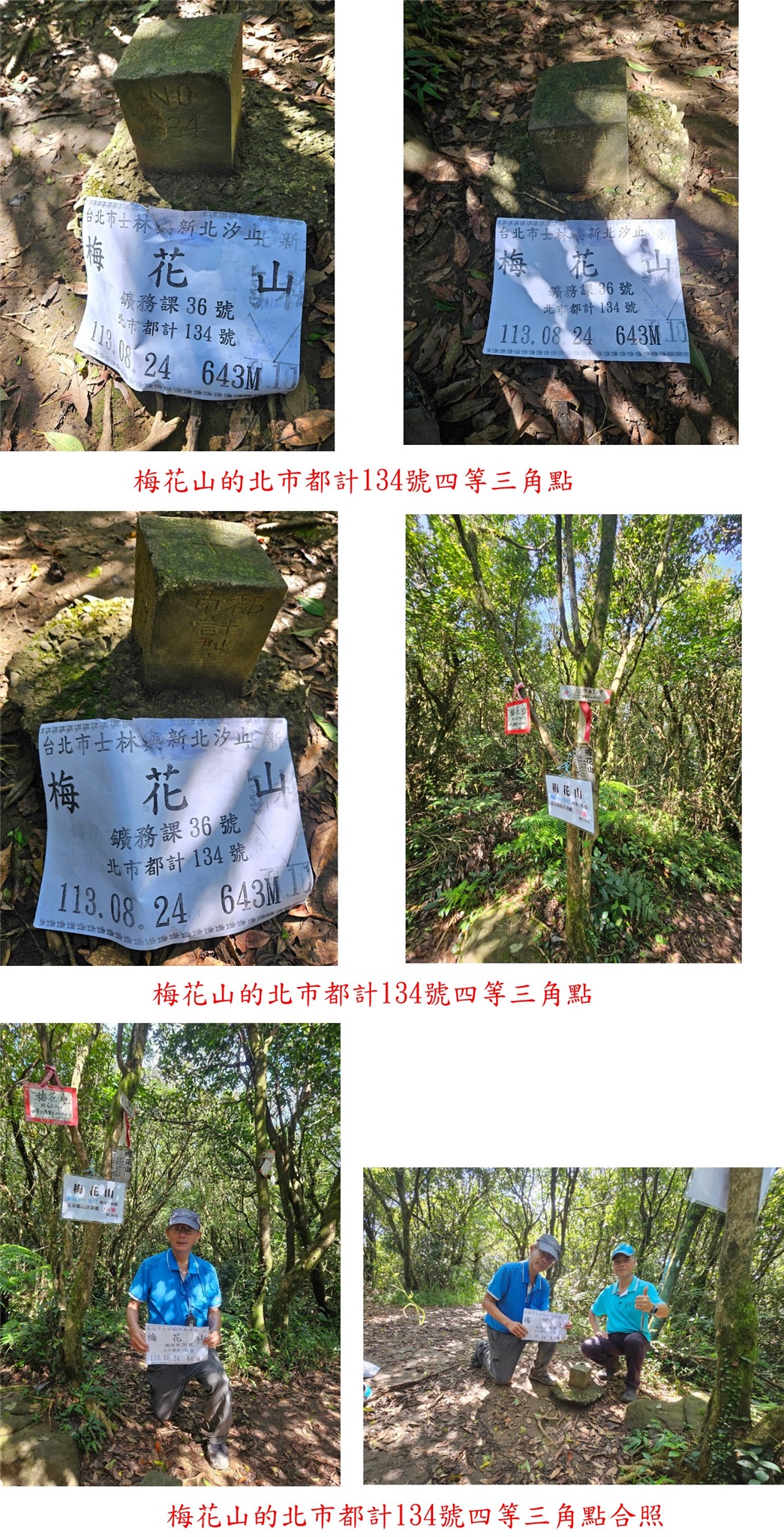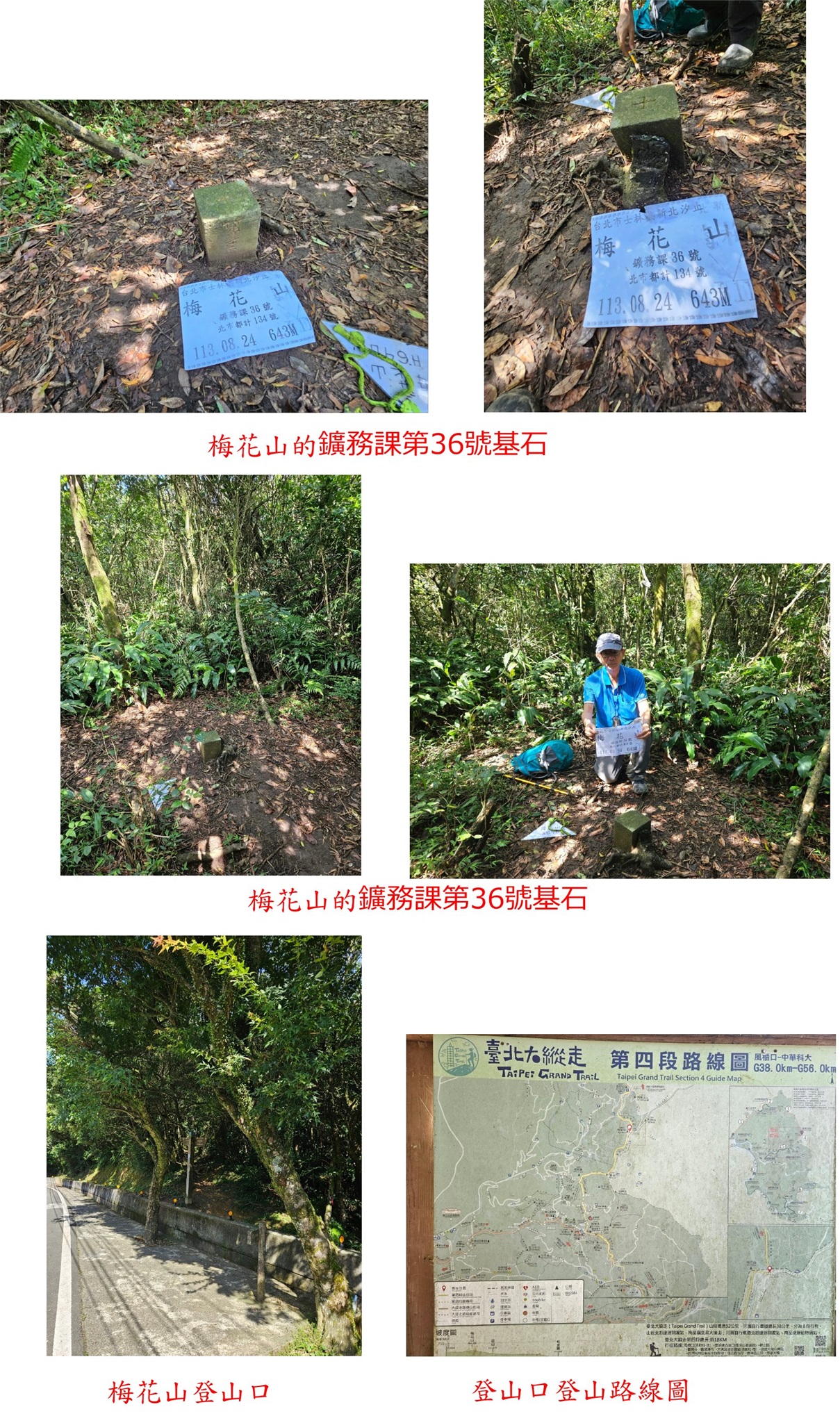 3、梅花山:位於台北市士林與新北汐止交界處,標高643公尺,鑛務課第36號與北市都計134號等2顆基石;座標分別為309832 2780045與309827 2780057。