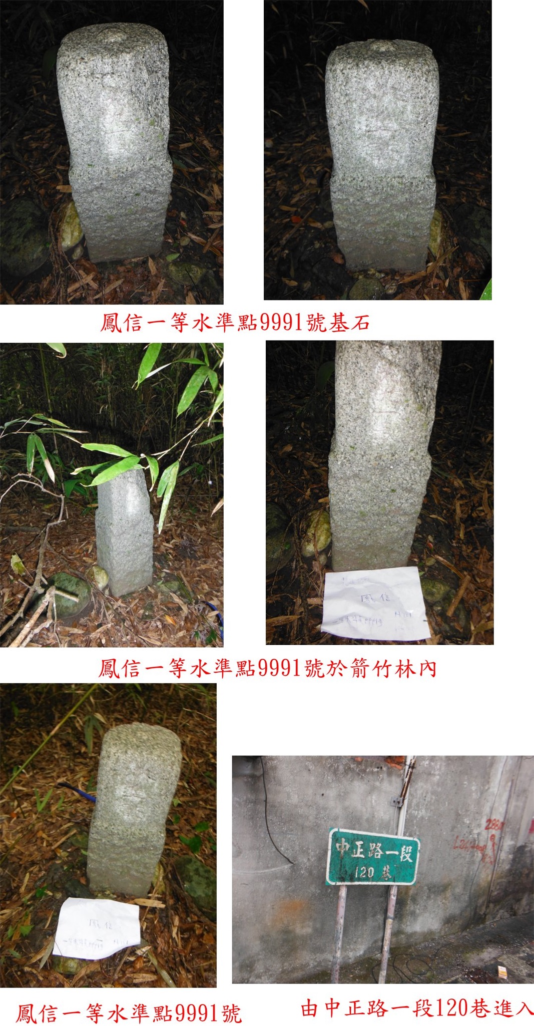 4、鳳信:位於花蓮縣鳳林鎮,標高121公尺,一等水準點9991號基石。