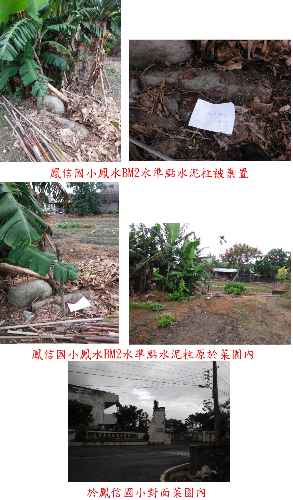 鳳信國小大門的對面有面紅磚牆,磚牆內為菜園與民宅,由叉路進入菜園卻找到鳳信國小的基石;四處找不到,最後遇到屋主在耕種,詢問得知原在菜園內,可能是妨礙耕作被挖起棄置於菜園的香蕉叢旁,鳳信國小的鳳水BM2水準點水泥柱倒地,胡亂拍張照片趕回林田山園區與同伴會合。